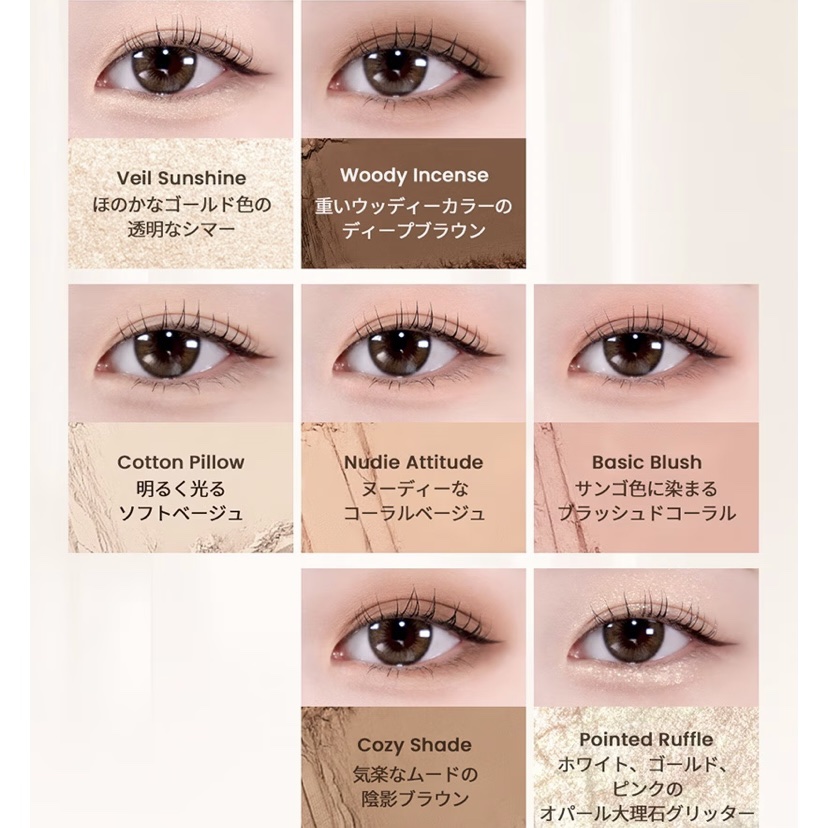- <01 オフベージュ> VEILSUNSHINE (1.8g)タルク、合成フルオロフロゴバイト、リンゴ酸ジイソステアリル、酸化チタン、トリ(カプリル酸/カプリン酸)グリセリル、イソステアリン酸水添ヒマシ油、ナイロン‐12、ミリスチン酸Mg、マイカ、ステアリン酸Mg、ポリメタクリル酸メチル/ カプリリルグリコール、カプリル酸グリセリル、赤色酸化鉄、エチルヘキシルグリセリン、黄色酸化鉄、酸化スズ、カルミン、黒色酸化鉄、トリエトキシカブリリルシラン、トコフェロール WOODY INCENSE(1.8g)タルク、マイカ、黄色酸化鉄、黒色酸化鉄、赤色酸化鉄、ポリメタクリル酸メチル、ラウロイルリシン、ジメチコン、ステアロイルオキシステアリン酸オクチルドデシル、リンゴ酸イソステアリル、水添野菜油、ミリスチン酸イソセチル、カプリリルグリコール、カプリル酸グリセリル、トリエトキシカプリリルシラン、エチルへキシルグリセリン、水添レシチン、トコフェロール COTTON PILLOW(1.8g)タルク、酸化チタン、マイカ、ポリメタクリル酸メチル、ラウロイルリシン、ジメチコン、黄色酸化鉄、ステアロイルオキシステアリン酸オクチルドデシル、リンゴ酸ジイソステアリル、水添野菜油、ミリスチン酸イソセチル、カプリリルグリコール、赤色酸化鉄、カプリル酸グリセリル、黒色酸化鉄、トリエトキシカプリリルシラン、エチルへキシルグリセリン、水添レシチン、トコフェロール NUDIE ATTITTUDE(11,7g)タルク、酸化チタン、マイカ、ポリメタクリル酸メチル、ラウロイルリシン、黄色酸化鉄、ジメチコン、赤色酸化鉄、ステアロイルオキシステアリン酸オクチルドデシル、リンゴ酸ジイソステアリル、水添野菜油、ミリスチン酸イソセチル、カブリリルグリコール、黒色酸化鉄、カブリル酸グリセリル、トリエ トキシカプリリルシラン、エチルヘキシルグリセリン、水添レシチン、トコフェロール BASIC BLUSH(1.7g)タルク、マイカ、ポリメタクリル酸メチル、酸化チタン、ラウロイルリシン、グンジョウ、赤色酸化鉄、ジメチコン、黄色酸化鉄、ステアロイルオキシステアリン酸オクチルドデシル、リンゴ酸ジイソステアリル、水添野菜油、黒色酸化鉄、ミリスチン酸イソセチル、カプリル酸グリコール、トリエトキシカプリリルシラン、カプリル酸グリセリル、エチルへキシルグリセリン、水添レシチン、カオリン、トコフェロール COZY SHADE(1.8g)タルク、マイカ、酸化チタン、ボリメタクリル酸メチル、黄色酸化鉄、赤色酸化鉄、ラウロイルリシン、黒色酸化鉄、ジメチコン、ステアロイルオキシステアリン酸オクチルドデシル、リンゴ酸ジイソステアリル、水添野菜油、ミリスチン酸イソセチル、グンジョウ、カプリリルグリコール、カプリル酸グリセリル、トリエトキシカプリリルシラ、エチルヘキシルグリセリン、水添レシチン、トコフェロール POINTED RUFFLE(1.5g)タルク、ホウケイ酸(Ca/AI)、ジメチコン、ポリメチルシルセスキオキサン、トリ(カプリ酸/カプリン酸)グリセリル、フェニルトリメチコン、リンゴ酸ジイソステアリル、ステアリン酸Mg、ホウケイ酸(Ca/チタン)、(ジメチコン/ビニルジトリメチコン)クロスポリマー、酸化チタン、カプリリルグリコール、カプリ酸グリセリル、エチルヘキシルグリセリン、酸化スズ、合成フルオロフロゴパイト、シリカ、赤色酸化鉄、黄色酸化鉄、トリエトキシカプリリルシラン、トコフェロール <02 ウォッシュドモーヴ> GLEAMING SATIN(1.6g)合成フルオロフロゴバイト、タルク、酸化チタン、ホウケイ酸(Ca/チタン)、トリエチルヘキサノイン、トリイソステアリン酸ポリグリセリルー2 、マイカ、ミリスチン酸Mg、ナイロン—12、イソステアリン酸水添ヒマシ油,ステアリン酸Mg 、ポリメタクリル酸メチル、赤色酸化鉄、カプリリルグリュール、カプリル酸グリセリル、エチルヘキシルグリセリン、酸化スズ、トュフェロール UNEVEN SHAPE(1.8g) タルク、黒色酸化鉄、マイカ、ポリメタクリル酸メチル、赤色酸化鉄、黄色酸化鉄、ラウロイルリシン、ジメチコン、ステアロイルオキシステアリン酸オクチルドデシル、リンゴ酸ジイソステアリル、水添野菜油,赤202、ミリスチン酸イソセチル、カプリリルグリコール、カプリル酸グリセリル、エチルヘキシルグリセリン、水添レシチン,トリエトキシカプリリルシラン、トコフェロール MUTEDCOTTON(1,7g)タルク、酸化チタン、マイカ、ポリメタクリル酸メチル、ラウロイルリシン、ジメチコン、赤色酸化鉄、グンジョウ、ステアロイルオキシステアリン酸オクチルドデシル、リンゴ酸ジイソステアリル、水添野菜油、ミリスチン酸イソセチル、カプリリルグリコール、黒色酸化鉄、カプリル酸グリセリル、エチルヘキシルグリセリン、黄色酸化鉄、トリエトキシカプリリルシラン、水添レシチン、トコフェロール FADEDMOOD(1.7g)タルク、マイカ、酸化チタン、ポリメタクリル酸メチル、赤色酸化鉄、ラウロイルリシン,黒色酸化鉄、ジメチコン、ステアロイルオキシステアリン酸オクチルドデシ