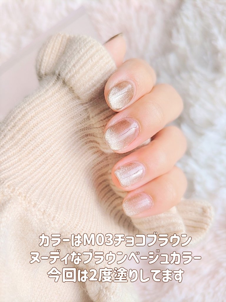 話題になっていた3coins(スリコ)で買えるマグネットジェルネイル🧲 カラーは【M14 ピンクブラウン】甘すぎないブラウン味のあるピンクカラーで可愛い😍 マグネットネイルなのでマグネットスティックを使ってラメを動かせます✨