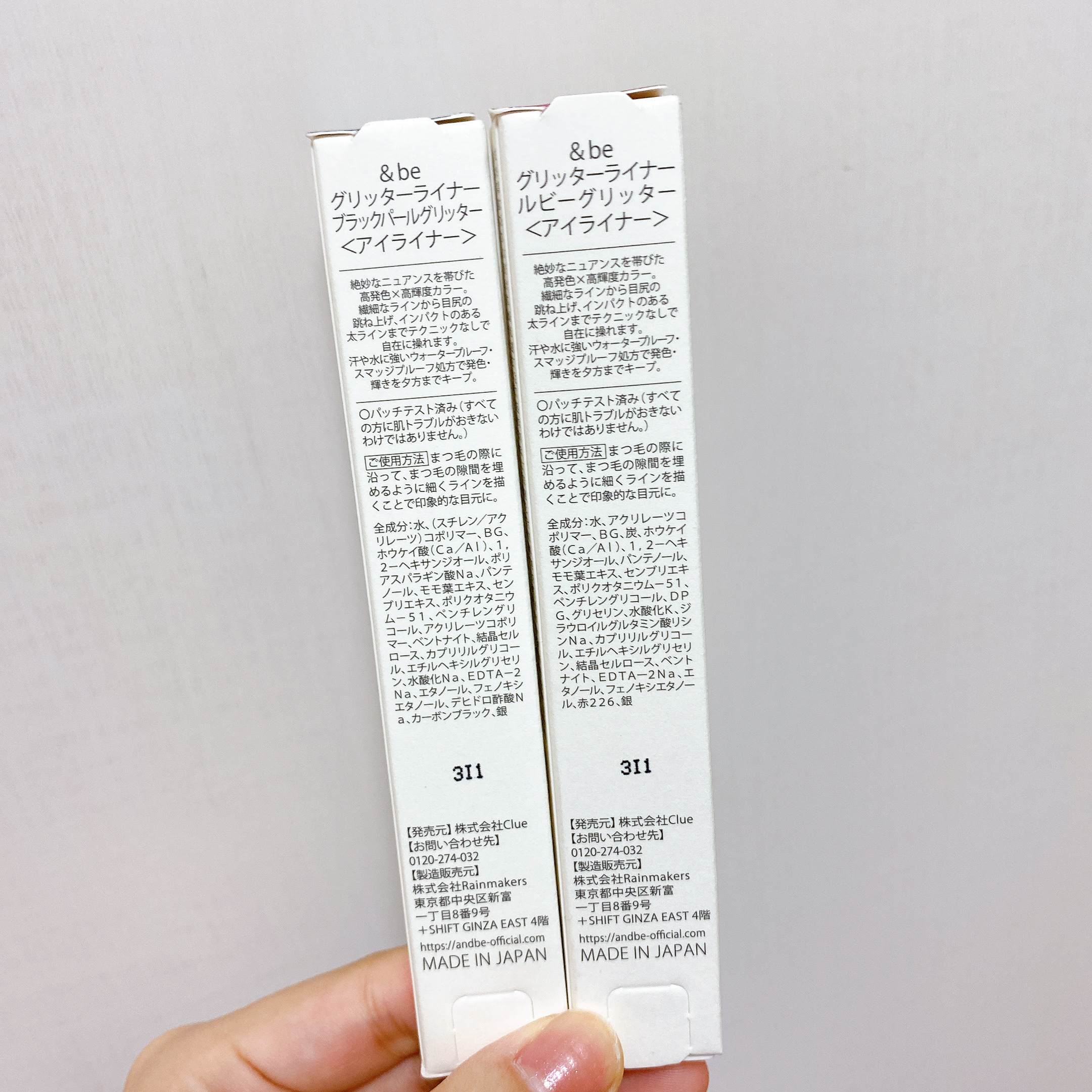 - <サファイアグリッター> 水、(スチレン/アクリレーツ)コポリマーアンモニウム、BG、ホウケイ酸(Ca/AI)、パンテノール、ポリクオタニウム-51、センブリエキス、モモ葉エキス、1,2-ヘキサンジオール、ペンチレングリコール、べへネス-25、ポリアスパラギン酸Na、ベントナイト、結晶セルロース、カプリリルグリコール、エチルヘキシルグリセリン、EDTA-2Na、エタノール、フェノキシエタノール、コンジョウ、酸化チタン、金 <エメラルドグリッター > 水、(スチレン/アクリレーツ)コポリマーアンモニウム、BG、シリカ、パンテノール、ポリクオタニウム-51、センブリエキス、モモ葉エキス、1,2-ヘキサンジオール、アクリレーツコポリマー、ペンチレングリコール、ポリアスパラギン酸Na、べへネス-30、結晶セルロース、ベントナイト、カプリリルグリコール、エチルヘキシルグリセリン、水酸化Na、EDTA-2Na、酸化スズ、エタノール、フェノキシエタノール、酸化鉄、グンジョウ、AI、銀