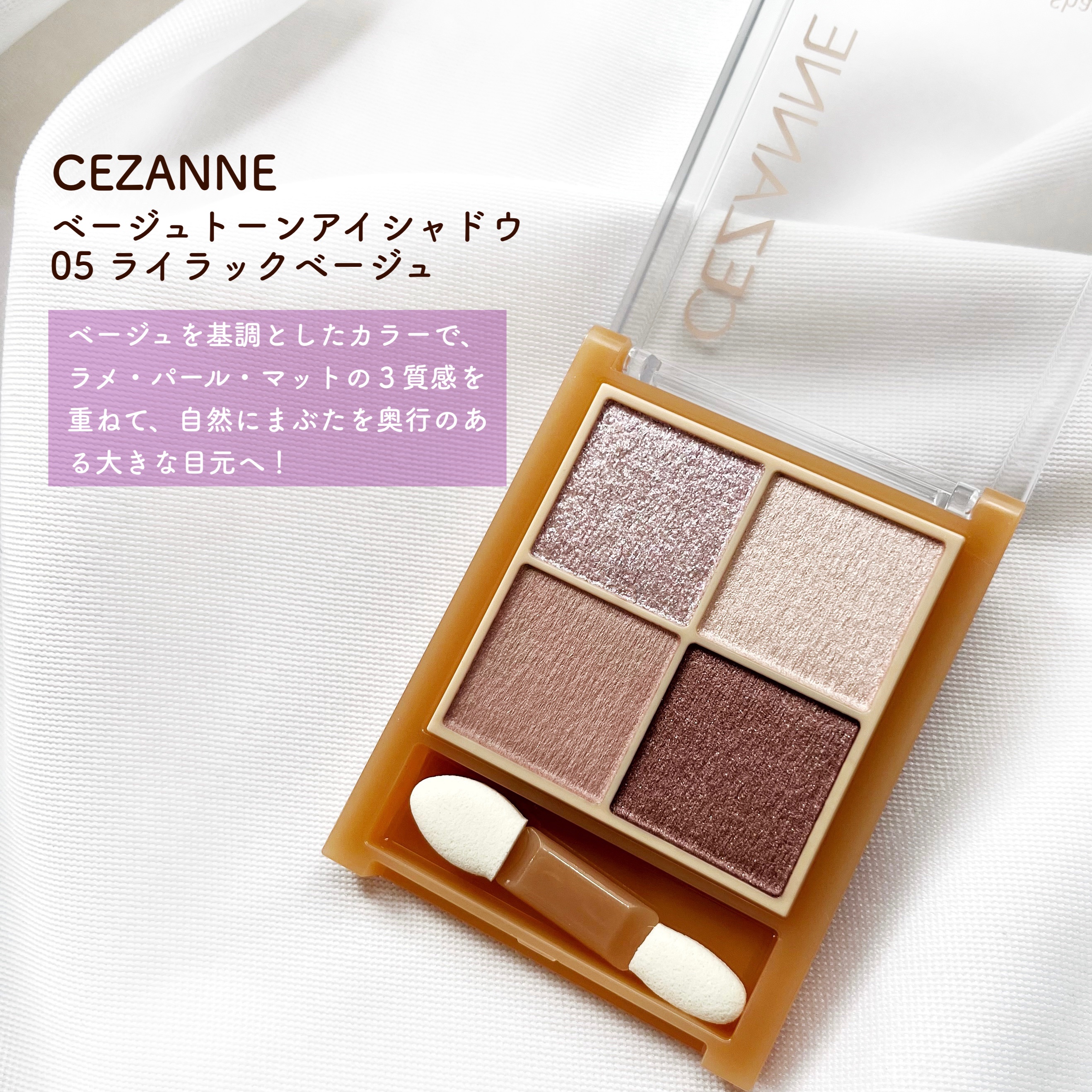🌷CEZANNEセザンヌ ベージュトーンアイシャドウ *05ライラックベージュラメ・パールマット3質感の4色アイシャドウ肌馴染み抜群のベージュを基調としたカラー。自然にまぶたを強調して、奥行のある大きな目元へ。★05ライラックベージュ ピュア...