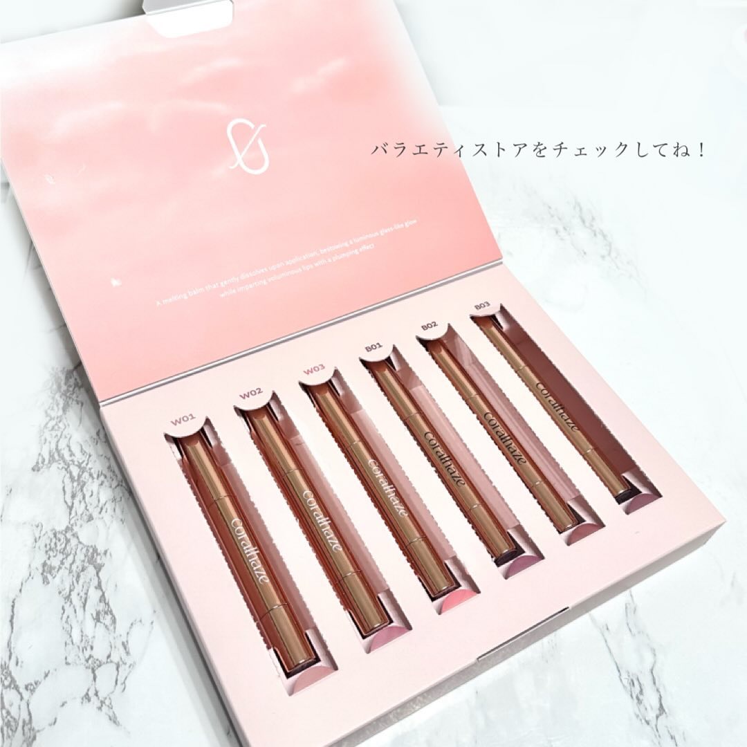 - White コンセプト / Blackコンセプトでお馴染みのCoralhazeから新たに6色追加となります。 特にBlackコンセプトに対する期待の声が寄せられていたこともあり、今回Black コンセプトから既存のBlack LineよりもさらにトーンダウンしたDark Lineが新登場。 番号の前にWが付いている商品はwhite Line、Bがついている商品はBlack Line、Dが付いている商品はDark Lineとなります。 1.唇に軽くメルティングされ蜂蜜を塗ったようなプルンとした輝きを与えます 2.プランパー成分配合でクーリング感とともにふっくらとしたボリューム、ツヤ感を与えます 3.ベタつきの少ないテクスチャーで重ね塗りしても快適に使用 4.パーソナルカラーに合わせて選べる10種類のカラー 5.高級感のあるゴールド色の容器を使用し感性的な満足感をお届けします 6.唇を保護し、保湿感を与えるスキンケア成分を配合 韓国では 「自身が持っている魅力をコーラルヘイズがより引き出す」 というパステルカラー調のコンセプトになっておりますが日本では今までの韓国コスメにはない、Black or White コンセプトになっております。 Black Lineはブラウンチョコレートを一滴垂らしたようなカラー White Lineは生クリームを一滴垂らしたようなカラー