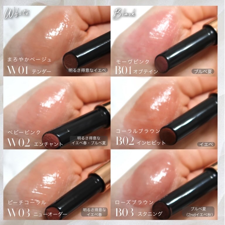色もちも良くって乾燥しにくいから文句のつけどころがない。 ☑︎201 Miro粘膜ピンクレッド→イエベ春・ブルベ夏 ☑︎203 Markじゅんわり多幸感コーラル→イエベ春 ☑︎204 Haveピュアなベイビーピンク→イエベ春・ブルベ夏(明るめ得意) ☑︎207 Depthレディな透けプラムレッド→ブルベ冬のデイリーブルベ夏の華やか ☑︎208 Poshニュートラルなレッド→ブルベ冬・イエベ春秋(鮮やか得意) ☑︎209 Near落ちついた洒落感オレンジ→イエベ春・イエベ秋(黄み得意) ☑︎213 Jeffブラウンが溶け込んだローズイエベ秋(2ndブルベ夏) ☑︎215 Lennaクリアで可憐な青みピンクブルベ夏冬(明るめ得意) ☑︎216 Winterディープなプラムレッドブルベ冬(青み得意)