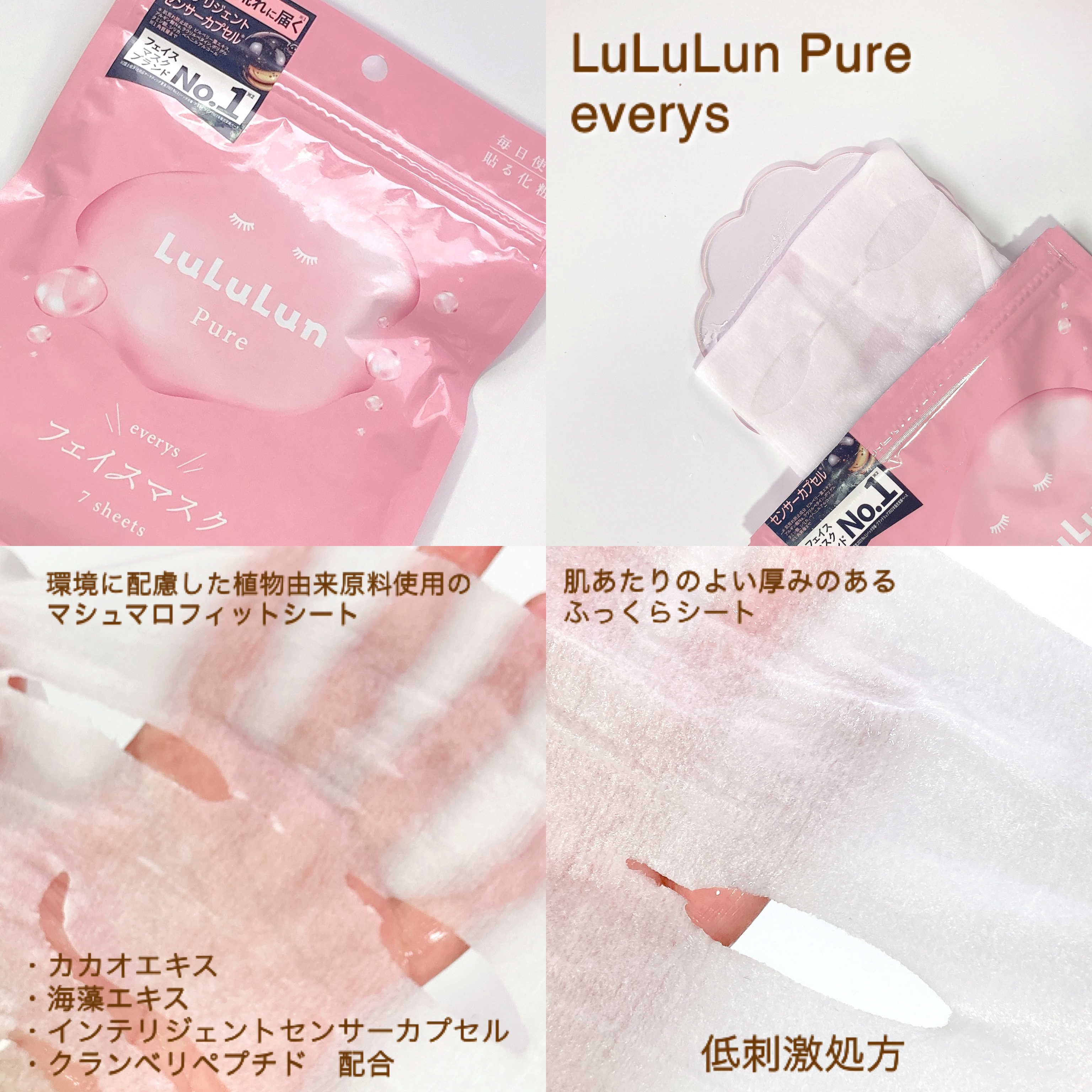- <ルルルンピュア エブリーズ 32枚入> 水、グリセリン、BG、グリセレス-26、PCA-Na、カカオエキス、ビルベリー葉エキス、シリカ、ベヘニルアルコール、アルギン酸Na、ラウリルベタイ ン、ポリグルタミン酸、トリ(カプリル酸/カプリン酸)グリセリル、レシチン、トコフェロール、クランベリー果実エキス、ワカメエキス、ツボクサエキス、オウ ゴン根エキス、イタドリ根エキス、カンゾウ根エキス、チャ葉エキス、ローズマリー葉エキス、カミツレ花エキス、グリチルリチン酸2K、キサンタンガム、(PEG240/デシルテトラデセス-20/HDI)コポリマー、EDTA-2Na、PEG-40水添ヒマシ油、クエン酸、クエン酸Na、1,2-へキサンジオール、カプリリルグリコール、フェノキ シエタノール、メチルパラベン <ルルルンピュア エブリーズ 7枚入> 水、グリセリン、BG、グリセレス-26、PCA-Na、カカオエキス、ビルベリー葉エキス、シリカ、ベヘニルアルコール、アルギン酸Na、ラウリルベタイ ン、ポリグルタミン酸、トリ(カプリル酸/カプリン酸)グリセリル、レシチン、トコフェロール、クランベリー果実エキス、ワカメエキス、ツボクサエキス、オウ ゴン根エキス、イタドリ根エキス、カンゾウ根エキス、チャ葉エキス、ローズマリー葉エキス、カミツレ花エキス、グリチルリチン酸2K、キサンタンガム、(PEG240/デシルテトラデセス-20/HDI)コポリマー、EDTA-2Na、PEG-40水添ヒマシ油、クエン酸、クエン酸Na、1,2-へキサンジオール、カプリリルグリコール、フェノキ シエタノール、メチルパラベン <ルルルンピュア ピンク(バランス) 7枚入【旧】> 水、グリセリン、BG、PCA-Na、グリチルリチン酸2K、ビルベリー葉エキス、シャクヤク花エキス、クランベリー果実エキス、乳酸桿菌発酵液、バチルス発酵物、レシチン、シトステロール、パルミチン酸アスコルビル、グルコノラクトン、グルタミン酸ジ酢酸4Na、ベンジルアルコール、アルギン酸Na、ラウリルベタイン、ポリグルタミン酸、シリカ、ベヘニルアルコール、水酸化Na、PEG-40水添ヒマシ油、キサンタンガム、クエン酸、クエン酸Na、フェノキシエタノール、メチルパラベン <ルルルンピュア ピンク(バランス) 36枚入【旧】> 水、グリセリン、BG、PCA-Na、グリチルリチン酸2K、ビルベリー葉エキス、シャクヤク花エキス、クランベリー果実エキス、乳酸桿菌発酵液、バチルス発酵物、レシチン、シトステロール、パルミチン酸アスコルビル、グルコノラクトン、グルタミン酸ジ酢酸4Na、ベンジルアルコール、アルギン酸Na、ラウリルベタイン、ポリグルタミン酸、シリカ、ベヘニルアルコール、水酸化Na、PEG-40水添ヒマシ油、キサンタンガム、クエン酸、クエン酸Na、フェノキシエタノール、メチルパラベン