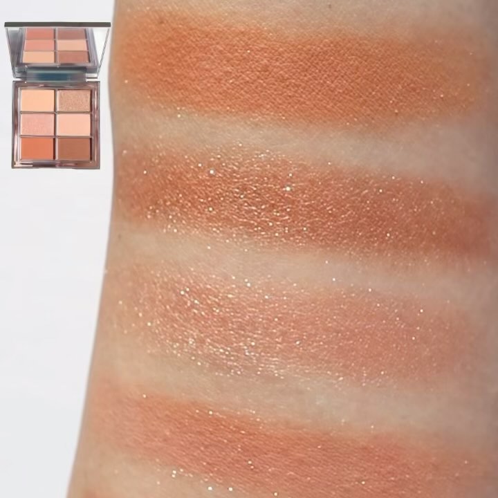 全色ラメの6色オレンジブラウンパレット🎨 こういうのってラメの粉飛びが気になるけど粉質が良いです! 粉質も柔らかくて発色はドバッと付きすぎずでも綺麗に色味がのってくれて最近出番の多いアイパレット パケも可愛いしミラーも大きくてみやすいので使いやすく、気に入ってます☺️