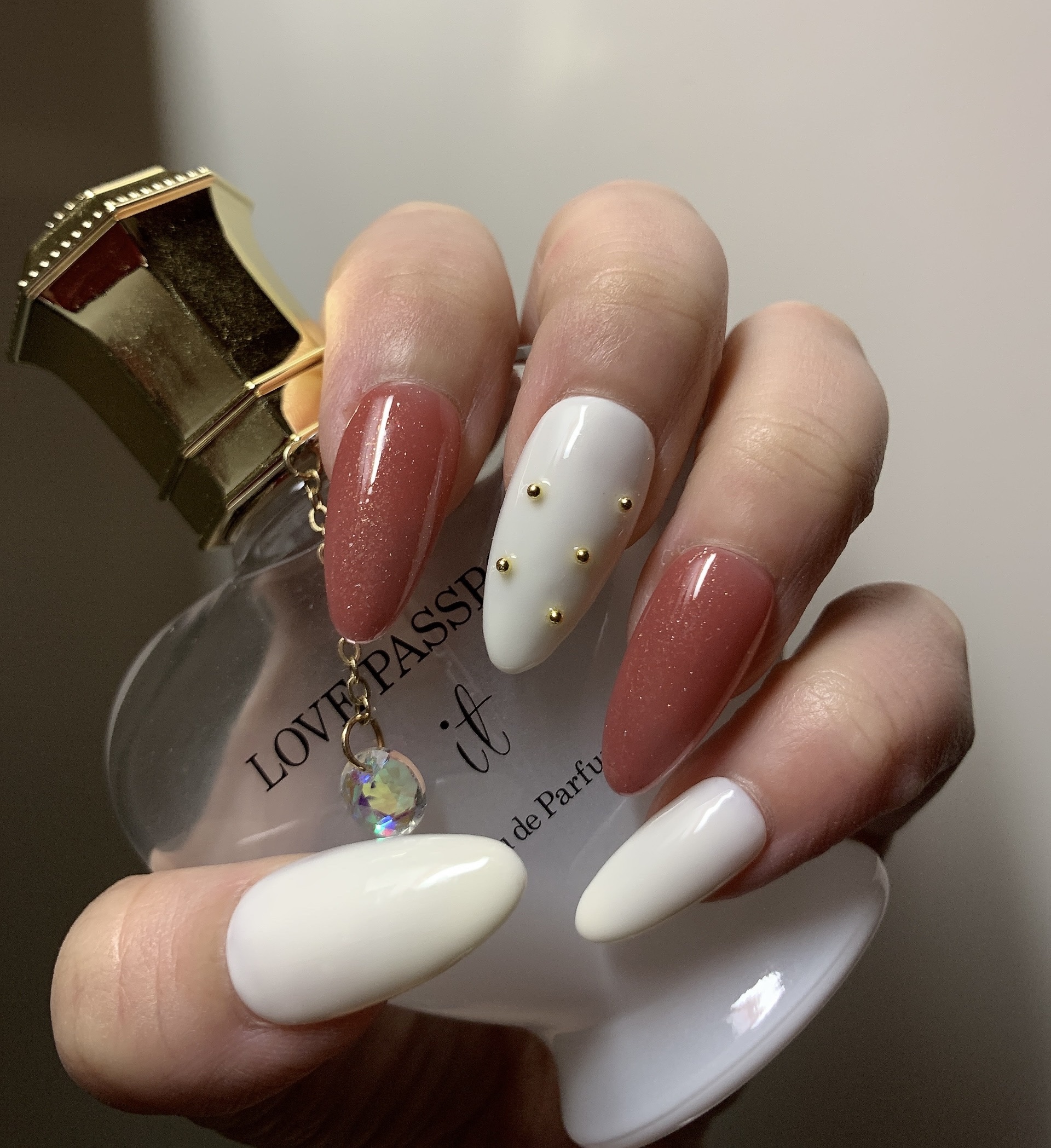 チョコレートをモチーフにしたネイル🍫 使用したのはほぼダイソー、セリア、キャンドゥです。 親指 DAISO 49ミルク+19アッシュブラウン+セリア ライナーゴールド 人差し指・小指 DAISO 49ミルク+ネイル工房85ミクロンマグネット01を塗り、トップジェルを垂らしぷっくりとした粒をつくる