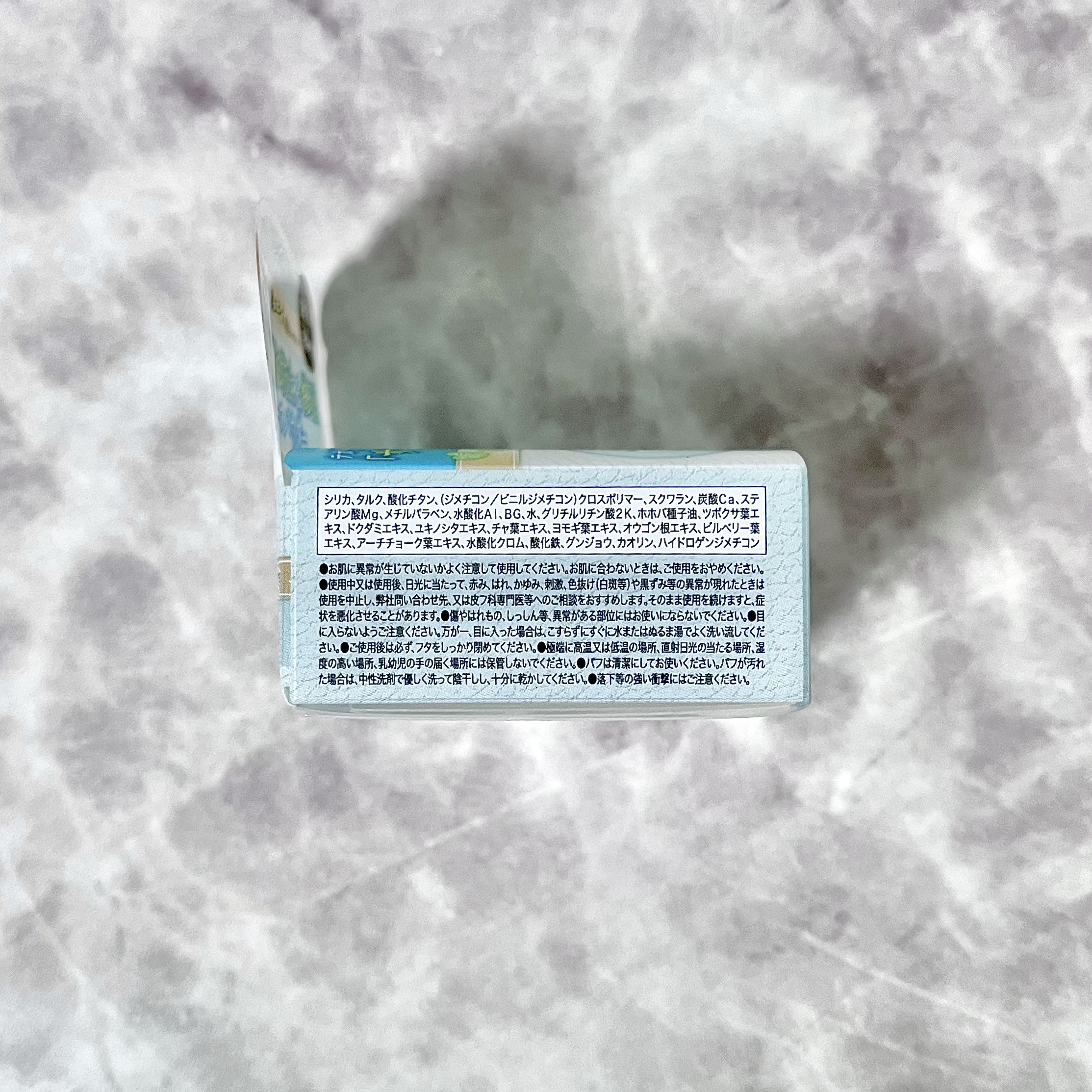 - <01 クリア> シリカ、タルク、酸化チタン、(ジメチコン/ビニルジメチコン)クロスポリマー、スクワラン、炭酸Ca、ステアリン酸Mg、メチルパラベン、水酸化Al、BG、水、グリチルリチン酸2K、ホホバ種子油、ユキノシタエキス、チャ葉エキス、ヨモギ葉エキス、オウゴン根エキス、ビルベリー葉エキス、アーチチョーク葉エキス <C01 フラッフィーミント> シリカ、タルク、酸化チタン、(ジメチコン/ビニルジメチコン)クロスポリマー、スクワラン、炭酸Ca、ステアリン酸Mg、メチルパラベン、水酸化Al、BG、水、グリチルリチン酸2K、ホホバ種子油、ツボクサ葉エキス、ドクダミエキス、ユキノシタエキス、チャ葉エキス、ヨモギ葉エキス、オウゴン根エキス、ビルベリー葉エキス、アーチチョーク葉エキス、水酸化クロム、酸化鉄、グンジョウ、カオリン、ハイドロゲンジメチコン