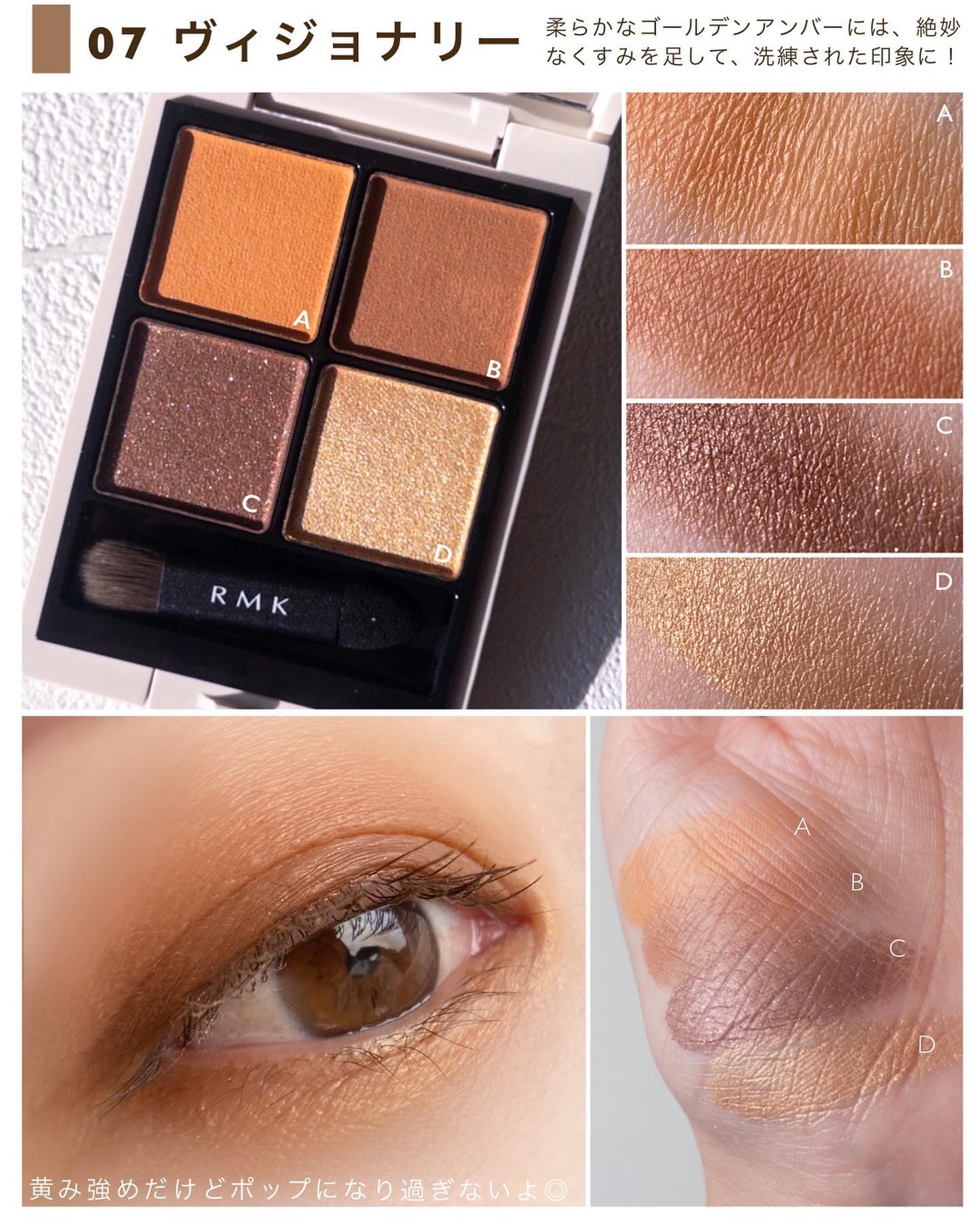 - 微差までこだわりぬいた色と質感のニューエッセンシャルパレット。 重ねるごとに深みを増し、 さまざまな質感やきらめきが混ざりあってつくり出すのは まるでワンカラーのように美しい、 やわらかくモダンなスモーキーアイ。 RMK新質感のライトシャイニーを含む、シャイニー、シマー、 パールシマー、マットのきらめきやツヤを放つ質感と色は、 それぞれが主役級でありながら4色すべてを重ねても濁らず、 奥ゆきを生みながらもダークにならない設計を追求しました。 白膜感や厚みの出にくい処方だから、 肌の色をいかしてクリアに発色。 透明感とツヤのあるパウダーが、 まぶたにやわらかくのび広がり、しっとりと肌と一体化。 肌になじみながらも主張する奥ゆきと透明感が目もとを彩り、 まとう人のパーソナリティをよりいっそう引き立てます。