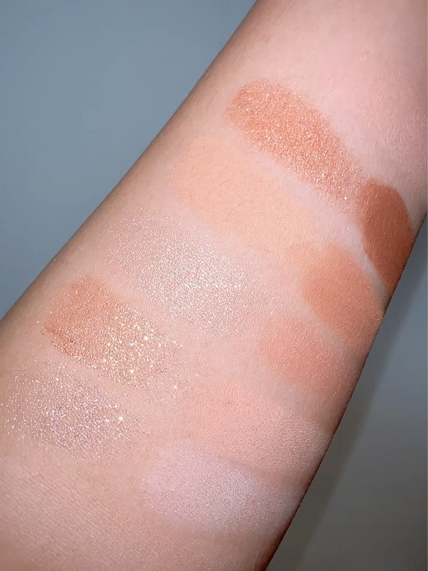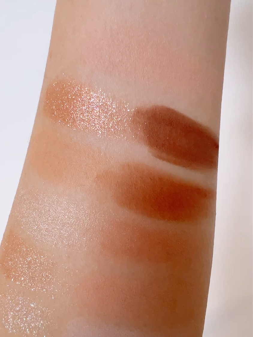 マットだけどどこかツヤ感もあるような柔らかい粉質……なのに粉飛びも少なめなので 瞼に乗せやすい🥰 5番のラメ感は控えめ。 シャンパンカラーに多色ラメがチラッ|˙꒳˙)✨ 実はこの番号通りにカラーを使うとプロ並みのメイクが完成するらしいです……‼️ ケースも薄くてコンパクトなのにベースカラー、ラメ、締め色、チークまで付いてるので 持ち運びやいつか行けるようになるであろう旅行などにも良さそうです❣️