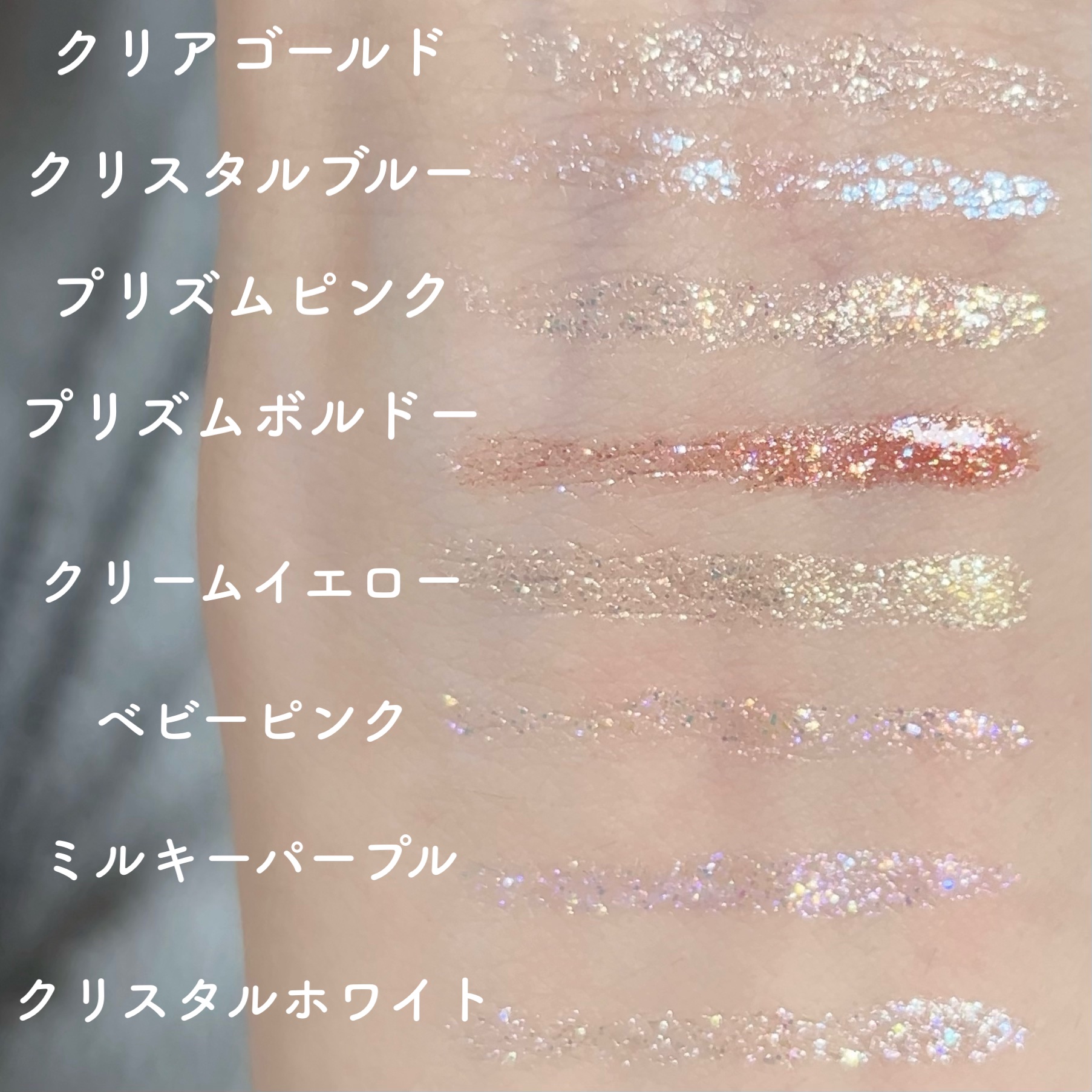 - <101 クリアゴールド> 水、BG、PEG-32、PEG‐6、グリセリン、PVP、(アクリロイルジメチルタウリンアンモニウム/VP)コポリマー、(アクリル酸ヒドロキシエチル/アクリロイルジメチルタウリンNa)コポリマー、スクワラン、エチルヘキシルグリセリン、ポリソルベート60、パンテノール、トコフェロール、アセチルヒアルロン酸Na、ナイアシンアミド、リン酸アスコルビルMg、リンゴ果実培養細胞エキス、α-グルカン、コーン油、パルミチン酸レチノール、グルコシルセラミド、ローズマリー葉エキス、PCA-Na、ビワ葉エキス、マグワ根皮エキス、乳酸Na、キサンタンガム、センチフォリアバラ花エキス、ブドウ葉エキス、加水分解コンキオリン、アルギニン、ノイバラ果実エキス、アスパラギン酸、PCA、ツボクサ葉エキス、レシチン、グリシン、アラニン、セリン、バリン、ユズ果実エキス、イソロイシン、トレオニン、プロリン、ヒスチジン、フェニルアラニン、フラーレン、メチルパラベン、フェノキシエタノール、ホウケイ酸(Ca/Na)、酸化チタン、酸化スズ <102 クリスタルブルー> 水、BG、PEG-32、PEG-6、グリセリン、PVP、(アクリロイルジメチルタウリンアンモニウム/VP)コポリマー、(アクリル酸ヒドロキシエチル/アクリロイルジメチルタウリンNa)コポリマー、スクワラン、エチルヘキシルグリセリン、ポリソルベート60、パンテノール、トコフェロール、アセチルヒアルロン酸Na、ナイアシンアミド、リン酸アスコルビルMg、リンゴ果実培養細胞エキス、α‐グルカン、コーン油、パルミチン酸レチノール、グルコシルセラミド、ローズマリー葉エキス、PCA-Na、ビワ葉エキス、マグワ根皮エキス、乳酸Na、キサンタンガム、センチフォリアバラ花エキス、ブドウ葉エキス、加水分解コンキオリン、アルギニン、ノイバラ果実エキス、アスパラギン酸、PCA、ツボクサ葉エキス、レシチン、グリシン、アラニン、セリン、バリン、ユズ果実エキス、イソロイシン、トレオニン、プロリン、ヒスチジン、フェニルアラニン、フラーレン、メチルパラベン、フェノキシエタノール、ホウケイ酸(Ca/Na)、酸化チタン、合成フルオロフロゴパイト、マイカ、ホウケイ酸(Ca/AI)、シリカ、酸化スズ、酸化鉄 <201 プリズムピンク> 水、BG、PEG-32、PEG-6、グリセリン、PVP、(アクリロイルジメチルタウリンアンモニウム/VP)コポリマー、(アクリル酸ヒドロキシエチル/アクリロイルジメチルタウリンNa)コポリマー、スクワラン、エチルヘキシルグリセリン、ポリソルベート60、パンテノール、トコフェロール、アセチルヒアルロン酸Na、ナイアシンアミド、リン酸アスコルビルMg、リンゴ果実培養細胞エキス、α-グルカン、コーン油、パルミチン酸レチノール、グルコシルセラミド、ローズマリー葉エキス、PCA-Na、ビワ葉エキス、マグワ根皮エキス、乳酸Na、キサンタンガム、センチフォリアバラ花エキス、ブドウ葉エキス、加水分解コンキオリン、アルギニン、ノイバラ果実エキス、アスパラギン酸、PCA、ツボクサ葉エキス、レシチン、グリシン、アラニン、セリン、バリン、ユズ果実エキス、イソロイシン、トレオニン、プロリン、ヒスチジン、フェニルアラニン、フラーレン、メチルパラベン、フェノキシエタノール、(PET/ポリメタクリル酸メチル)ラミネート、ホウケイ酸(Ca/Na)、酸化チタン、ホウケイ酸(Ca/AI)、マイカ、シリカ、酸化スズ、酸化鉄、合成フルオロフロゴパイト <202 プリズムボルドー> 水、BG、PEG-32、PEG-6、グリセリン、PVP、(アクリロイルジメチルタウリンアンモニウム/VP)コポリマー、(アクリル酸ヒドロキシエチル/アクリロイルジメチルタウリンNa)コポリマー、スクワラン、エチルヘキシルグリセリン、ポリソルベート60、パンテノール、トコフェロール、アセチルヒアルロン酸Na、ナイアシンアミド、リン酸アスコルビルMg、リンゴ果実培養細胞エキス、α-グルカン、コーン油、パルミチン酸レチノール、グルコシルセラミド、ローズマリー葉エキス、PCA-Na、ビワ葉エキス、マグワ根皮エキス、乳酸Na、キサンタンガム、センチフォリアバラ花エキス、ブドウ葉エキス、加水分解コンキオリン、アルギニン、ノイバラ果実エキス、アスパラギン酸、PCA、ツボクサ葉エキス、レシチン、グリシン、アラニン、セリン、バリン、ユズ果実エキス、イソロイシン、トレオニン、プロリン、ヒスチジン、フェニルアラニン、フラーレン、メチルパラベン、フェノキシエタノール、(PET/ポリメタクリル酸メチル)ラミネート、ホウケイ酸(Ca/Na)、ホウケイ酸(Ca/AI)、酸化チタン、マイカ、酸化鉄、シリカ、合成フルオロフロゴパイト、酸化スズ <103 シャンパンベージュ> 水、BG、PEG-32、PEG-6、グリセリン、PVP、(アクリロイルジメチルタウリンアンモニウム/VP)コポリマー、(アクリル酸ヒドロキシエチル/アクリロイルジメチルタウリンNa)コポリマー、スクワラン、エチルヘキシルグリセリン、ポリソルベート60、パンテノール、トコフェロール、アセチルヒアルロン酸Na、ナイアシンアミ