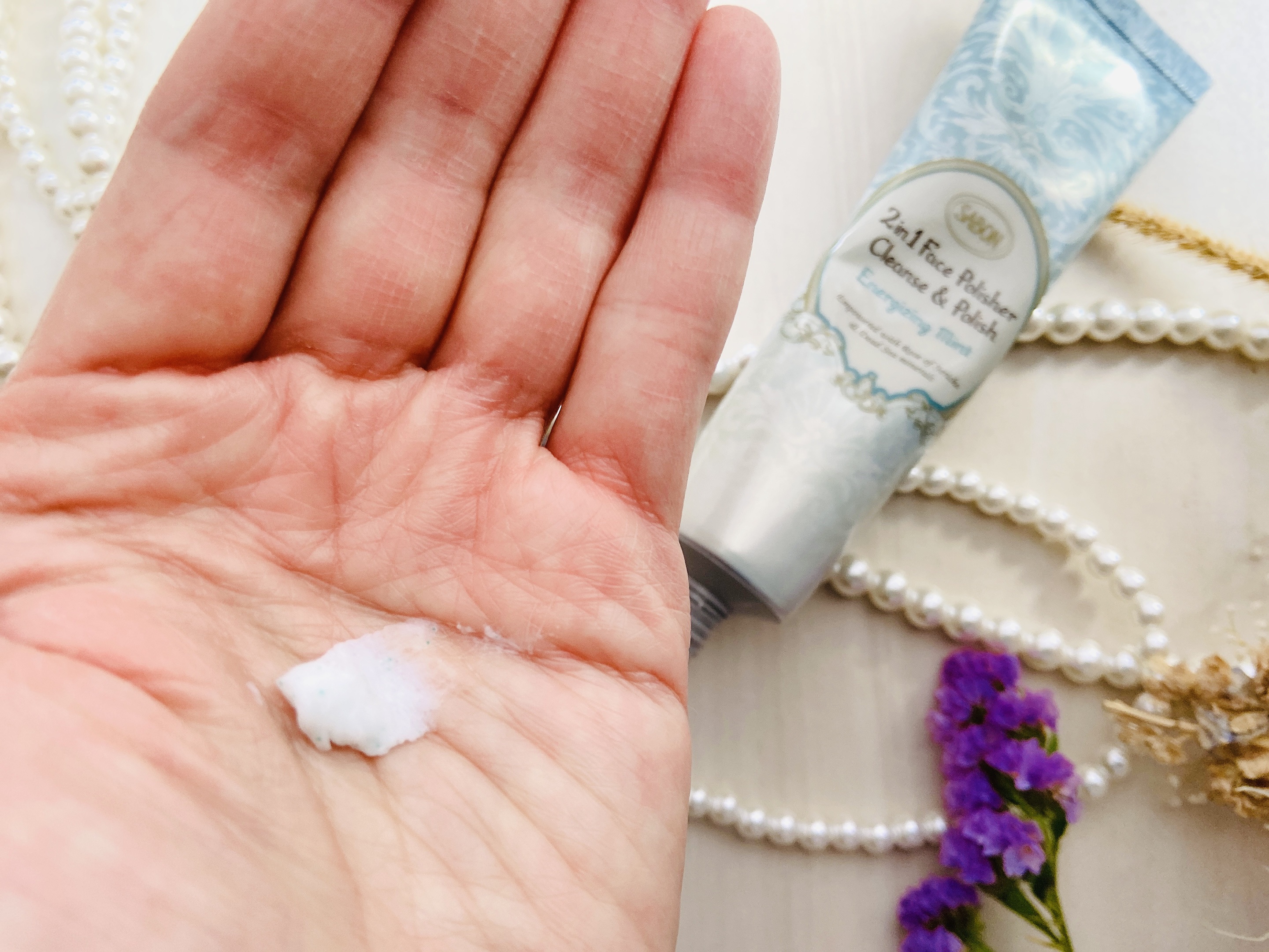 - 毛穴レスの柔肌を1品で叶える、2in1スクラブ洗顔 洗顔と角質ケアを同時に叶えるフェイス用スクラブ。ホホバ由来のスクラブ粒子*で古い角質や毛穴の汚れを取り除き、死海のミネラル**とジェリコローズ***がお肌に潤いを与えます。水分と油分のバランスを整えながら、なめらかな素肌に磨き上げます。清涼感のあるミントの香りで、すっきりしたい朝の肌におすすめです。 *ステアリン酸ステアリル、キャンデリラロウ、ホホバエステル(洗浄補助)**海塩(整肌)***アンザンジュエキス(保湿)