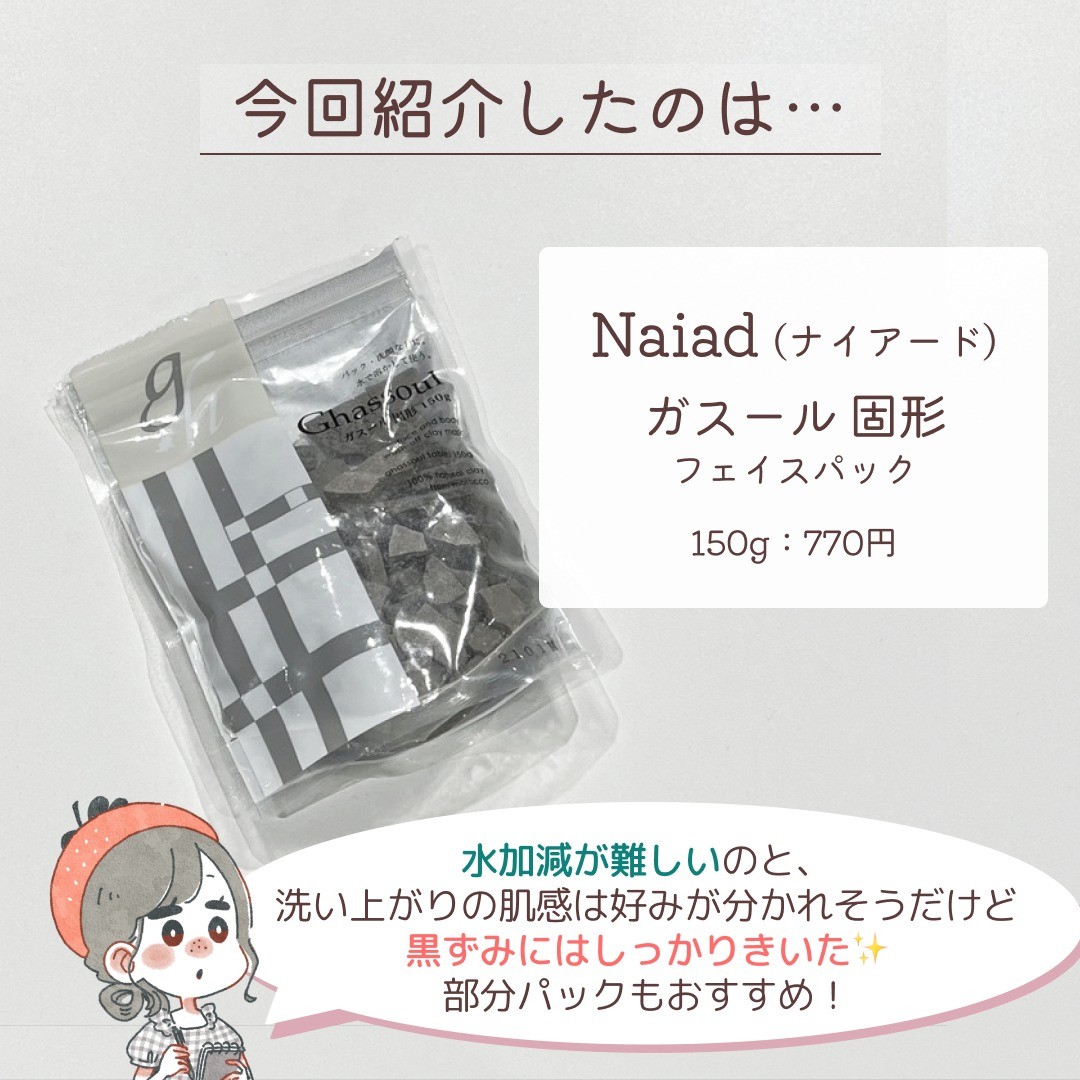 - モロッコで古くから石鹸のように使われてきたクレイ(粘土)、ガスール。ナイアードのガスールは、原石を地下水で溶かし、ろ過して、太陽と風で乾かしたシンプルなものです。粘土の吸着力が肌の汚れを取り除き、ミネラルが顔や髪、身体をしっとりとなめらかに洗い上げ、整えます。 ガスール本来のふっくら柔らかな使い心地の「ガスール固形」、なめらかな使い心地の「ガスール粉末」の 2 タイプがあります。洗顔、パック、洗髪、全身の洗浄に。手づくり 化粧品の基材としても楽しめます。 ガスールで洗う ~大地が生み出した優しい使い心地~ 顔も髪も身体も、1つの素材でしっとり洗い上げます。 水に溶かすことで、粘土の粒子が磁石のように優しく汚れを吸い寄せるため、洗浄力は強くそれだけで肌や髪の汚れをしっかり落とします。ガスールには肌を穏やかに整えるというマグネシウム等のミネラルが多く含まれます。保湿力が高く、中性に近いため、肌にマイルドな触感をもたらします。 粘土そのものの力で汚れを落とし、保湿するので、保湿成分、石鹸分等を加える必要はありません。また、乾燥した状態で保管するので、保存料等の添加物も必要ありません。 ※ 一度水に溶かしてしまうと、雑菌等が混入する恐れがありますので、使う分だけをその都度溶かし、ペーストを作ってください。