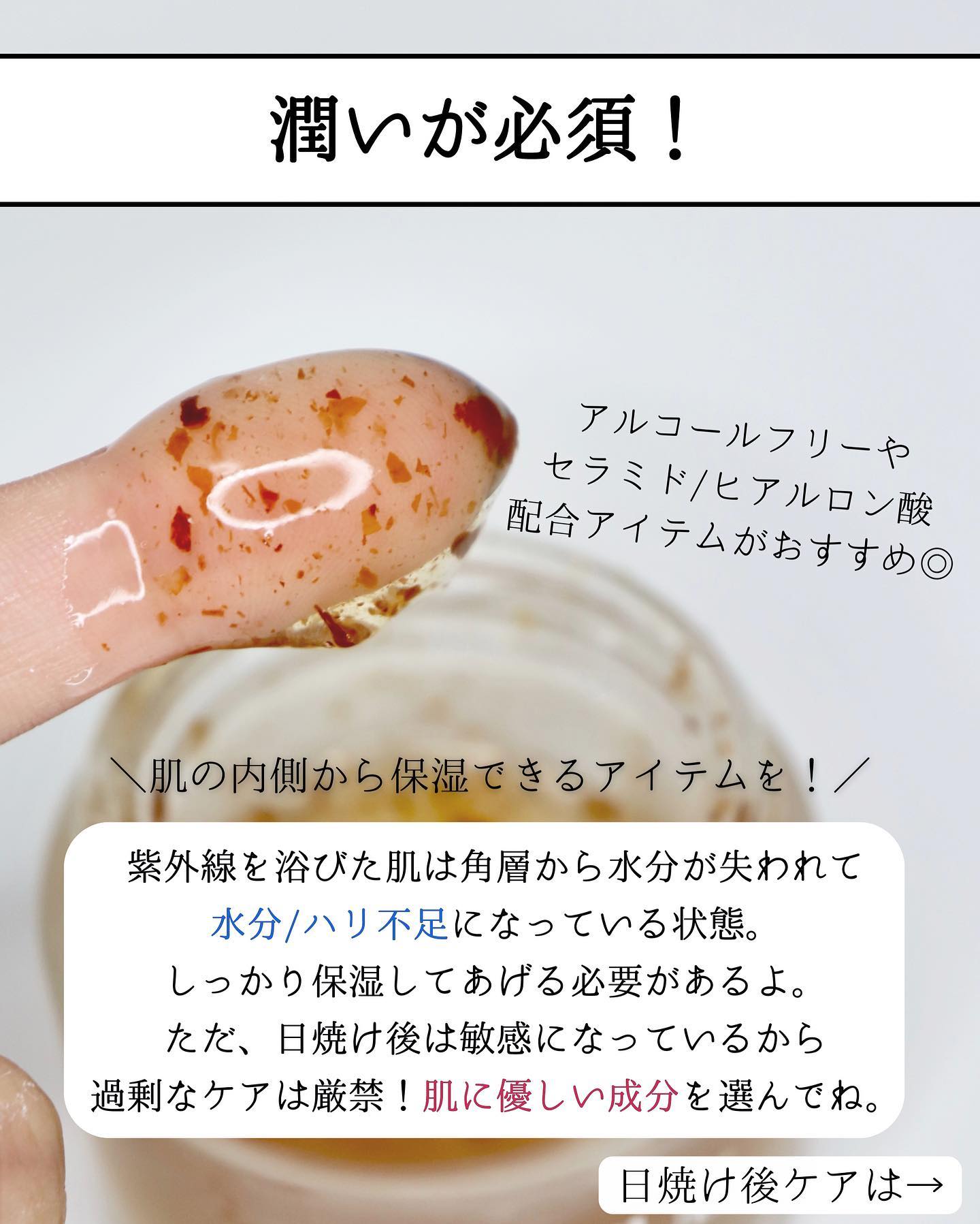 毛孔性角化症って言って、開いた毛穴に古い角質が角栓となって詰まって、その先端が突き出した状態がブツブツとなって皮膚表面に現れるの! 角栓が詰まることが原因だから、メイク汚れや皮脂をクレンジングでしっかり落として、サリチル酸などのピーリング成分で肌のターンオーバーを正常にすることが改善への第一歩! 保湿これ本当に大事で、角質層が乾燥してると肌を潤わせるために皮脂を過剰分泌しちゃうから、しっかり保湿することが大切!