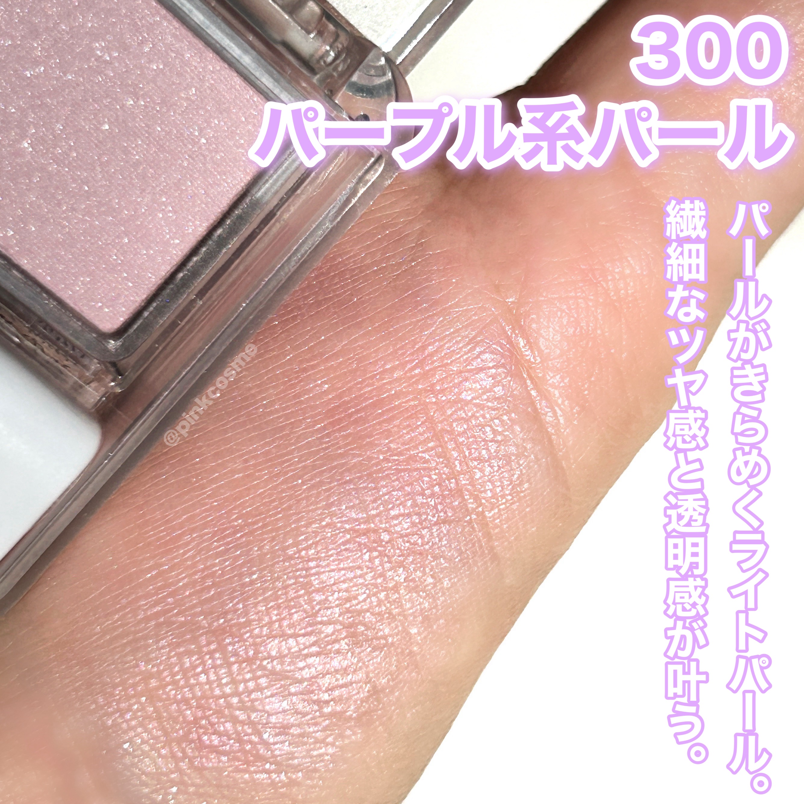 - <100 ピンク系パール> 着色成分 マイカ適量、〃 ホウケイ酸(Ca/Al)適量、〃 酸化チタン適量、〃 シリカ適量、〃 酸化鉄適量、〃 グンジョウ適量、〃 赤226適量、〃 硫酸Ba適量、〃 酸化スズ適量、油性エモリエント成分 ミネラルオイル8.99%、防腐剤 メチルパラベン適量、表面処理剤 水酸化Al適量、成分の酸化防止剤 トコフェロール適量、基剤 タルク全量を100%とする <300 パープル系パール> 着色成分 マイカ適量、〃 ホウケイ酸(Ca/Al)適量、〃 酸化チタン適量、〃 グンジョウ適量、〃 シリカ適量、〃 酸化鉄適量、〃 酸化スズ適量、油性エモリエント成分 ミネラルオイル9.00%、防腐剤 メチルパラベン適量、表面処理剤 水酸化Al適量、成分の酸化防止剤 トコフェロール適量、基剤 タルク全量を100%とする