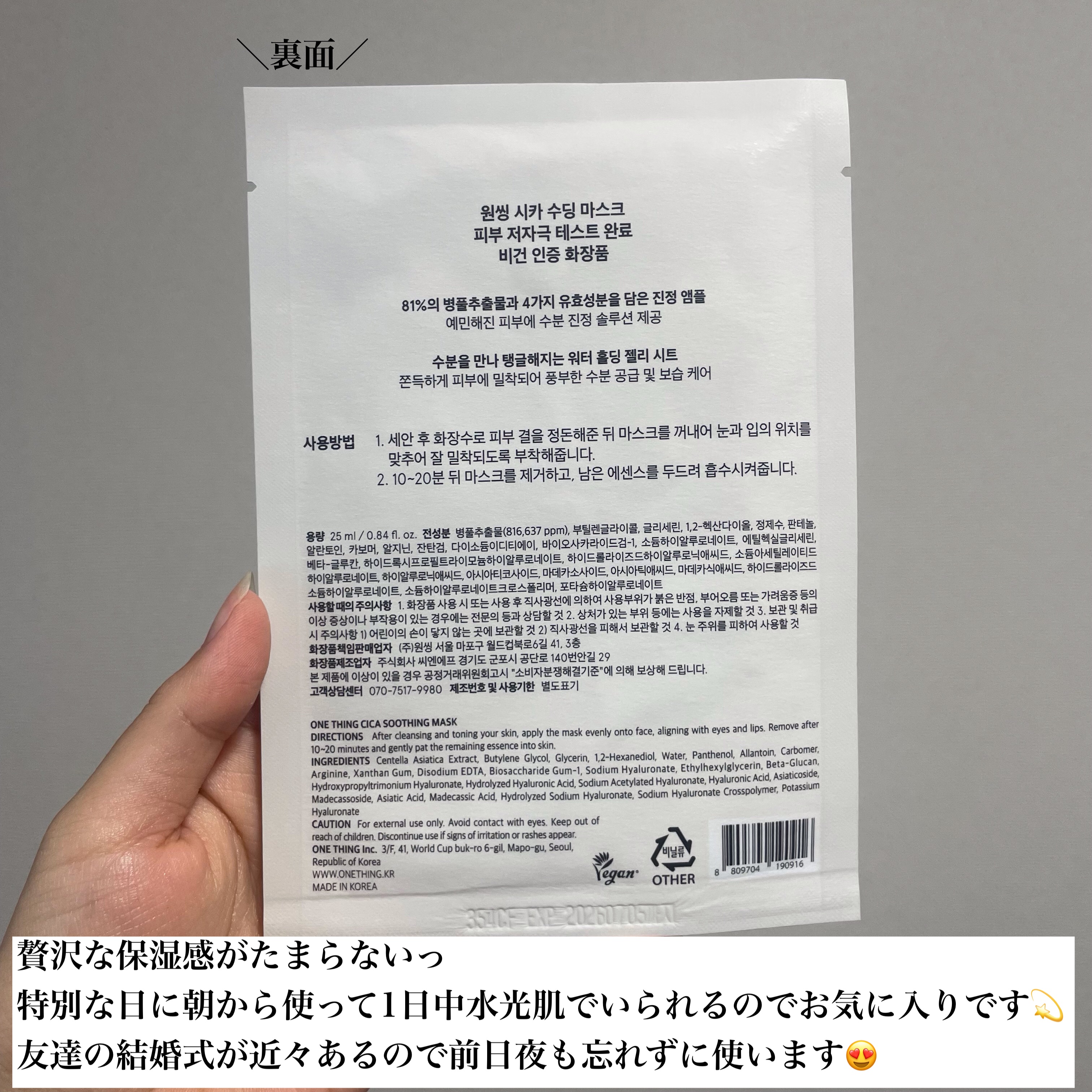 - 話題のCICA成分であるツボクサエキス*81%、ツボクサ由来の4つの整肌成分、パンテノール*が配合され、刺激**を受けた肌を素早く整えながら肌に水分を与え、保湿してくれます。独自開発のウォーターホールディングシート、生分解できるヴィーガン認証獲得のプレミアム・キュプラシート使用し、肌に刺激が少なく、柔らかな質感で、肌にも環境にも配慮しています。*整肌成分 **乾燥による