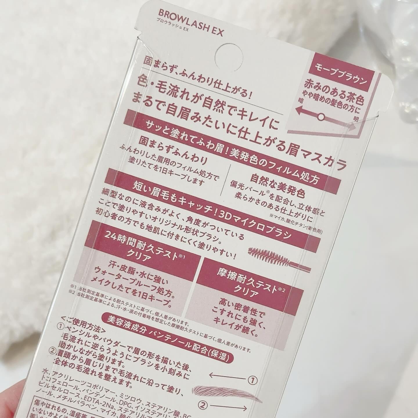 - 固まらず、ふんわり仕上がる! 色・毛流れが自然でキレイに まるで自眉みたいに仕上がる眉マスカラ ■サッと塗れてふわ眉!美発色のフィルム処方 固まらずふんわり:ふんわりした眉用のフィルム処方で塗りたてを1日キープします 自然な美発色:偏光パール※を配合し、立体感と柔らかさのある仕上がりに ※マイカ、酸化チタン(着色剤) ■短い眉毛もキャッチ!3Dマイクロブラシ 細型なのに液含みがよく、角度がついていることで塗りやすいオリジナル形状ブラシ。 初心者の方でも地肌に付きにくく塗りやすい! ■24時間耐久テスト*1 クリア 汗・皮脂・水に強いウォータープルーフ処方。メイクしたてを1日キープ。 ■摩擦耐久テスト*2 クリア 高い密着性でこすれにも強く、キレイが続く。 *1 当社測定基準による耐久テストに基づく。個人差があります。 *2 当社測定基準による、汗・水・涙の付着時を想定した摩擦耐久テストに基づく。個人差があります。 ■美容液成分 パンテノール配合(保湿)