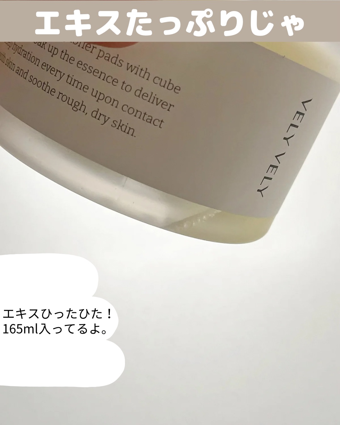 麦芽エキスが30,000ppm配合されたパッド。 肌あたりも柔らかく優しく拭き取りできます。 表面ぽこぽこタイプじゃなくて四角いキューブ状の穴に水分を閉じ込めて肌に当たる時もしっとりしているそう。 パッドが7mmと大きくてエッセンスがヒタヒタに入っているから一番上のパッドもうるうるで嬉しい^ ^