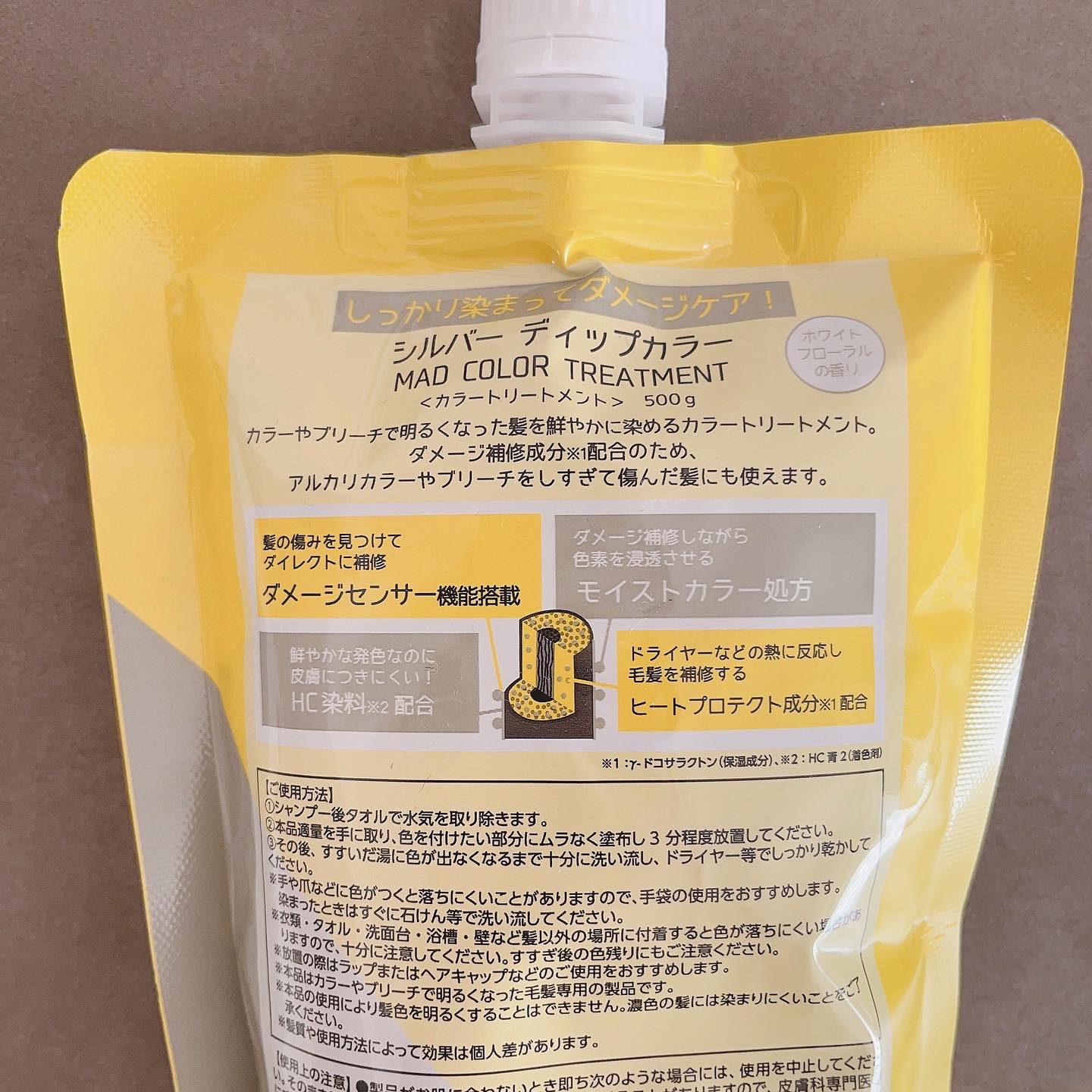 - <シルバー> 水、セテアリルアルコール、グリセリン、セバシン酸ジエチルヘキシル、水添ポリイソブテン、シクロペンタシロキサン、BG、アモジメチコン、ベヘントリモニウムクロリド、ポリクオタニウムー37、加水分解ケラチン(羊毛)、加水分解シルク、加水分解コラーゲン、γードコサラクトン、液状ラノリン、(加水分解シルク/PGプロピルメチルシランジオール)クロスポリマー、アルガニアスピノサ核油、シア脂、ハチミツ、アルギニン、トコフェロール、フィトステロールズ、カプリル酸グリセリル、乳酸、ポリクオタニウムー7、グアーヒドロキシプロピルトリモニウムクロリド、ステアルトリモニウムクロリド、ジステアリルジモニウムクロリド、ステアリン酸グリセリル、塩化Na、ビスセテアリルアモジメチコン、ジメチコン、プロパンジオール、イジプロパノール、エタノール、フェノキシエタノール、安息香酸Na、香料、(+/-)塩基性青99、塩基性茶16、塩基性赤76、塩基性紫2、HC青2 <パープル> 水、グリセリン、セタノール、パルミチン酸エチルヘキシル、ステアリルアルコール、ベヘントリモニウムクロリド、ジメチコン、白金、γ-ドコサラクトン、シア脂、ハチミツ、アルガニアスピノサ核油、フィトステロールズ、アルギニン、乳酸、PEG-90M、アモジメチコン、ステアルトリモニウムクロリド、ポリソルベート80、ジステアリルジモニウムクロリド、プロパンジオール、イソプロパノール、エタノール、フェノキシエタノール、香料、(+/-)塩基性青124、塩基性赤51、塩基性黄57、HC黄4、HC青2、塩基性紫2 <ピンク> 水、グリセリン、セタノール、パルミチン酸エチルヘキシル、ステアリルアルコール、ベヘントリモニウムクロリド、ジメチコン、白金、γ-ドコサラクトン、シア脂、ハチミツ、アルガニアスピノサ核油、フィトステロールズ、アルギニン、乳酸、PEG-90M、アモジメチコン、ステアルトリモニウムクロリド、ポリソルベート80、ジステアリルジモニウムクロリド、プロパンジオール、イソプロパノール、エタノール、フェノキシエタノール、香料、(+/-)塩基性青124、塩基性赤51、塩基性黄57、HC黄4、HC青2、塩基性紫2 <ミルクティー> 水、セテアリルアルコール、グリセリン、セバシン酸ジエチルヘキシル、水添ポリイソブテン、シクロペンタシロキサン、BG、アモジメチコン、ベヘントリモニウムクロリド、ポリクオタニウムー37、加水分解ケラチン(羊毛)、加水分解シルク、加水分解コラーゲン、γードコサラクトン、液状ラノリン、(加水分解シルク/PGプロピルメチルシランジオール)クロスポリマー、アルガニアスピノサ核油、シア脂、ハチミツ、アルギニン、トコフェロール、フィトステロールズ、カプリル酸グリセリル、乳酸、ポリクオタニウムー7、グアーヒドロキシプロピルトリモニウムクロリド、ステアルトリモニウムクロリド、ジステアリルジモニウムクロリド、ステアリン酸グリセリル、塩化Na、ビスセテアリルアモジメチコン、ジメチコン、プロパンジオール、イジプロパノール、エタノール、フェノキシエタノール、安息香酸Na、香料、(+/-)塩基性青99、塩基性茶16、塩基性赤76、塩基性紫2、HC青2