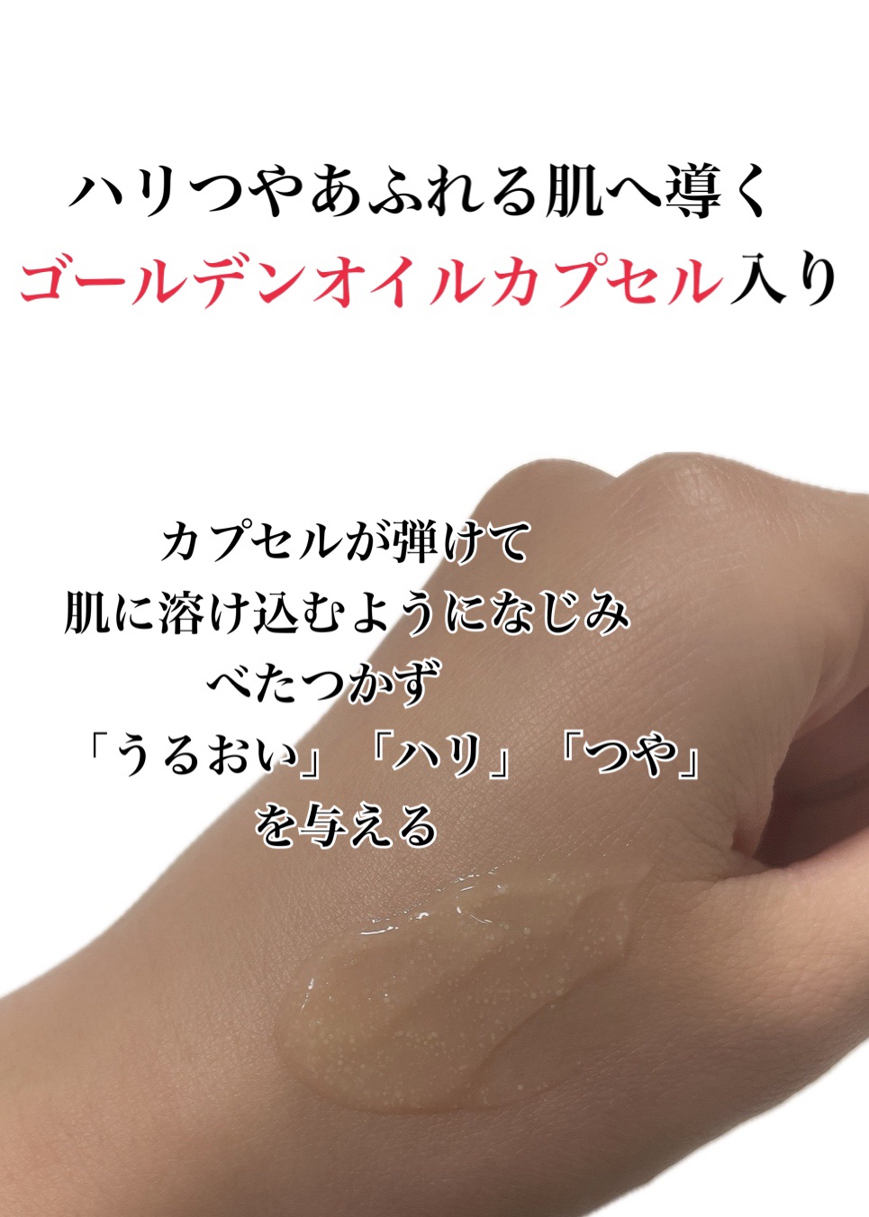 | 透明なジェルに黄色い粒がたっぷり。オイルカプセルによるリッチなコクうるがクセになる。 | 詳細を見る | |