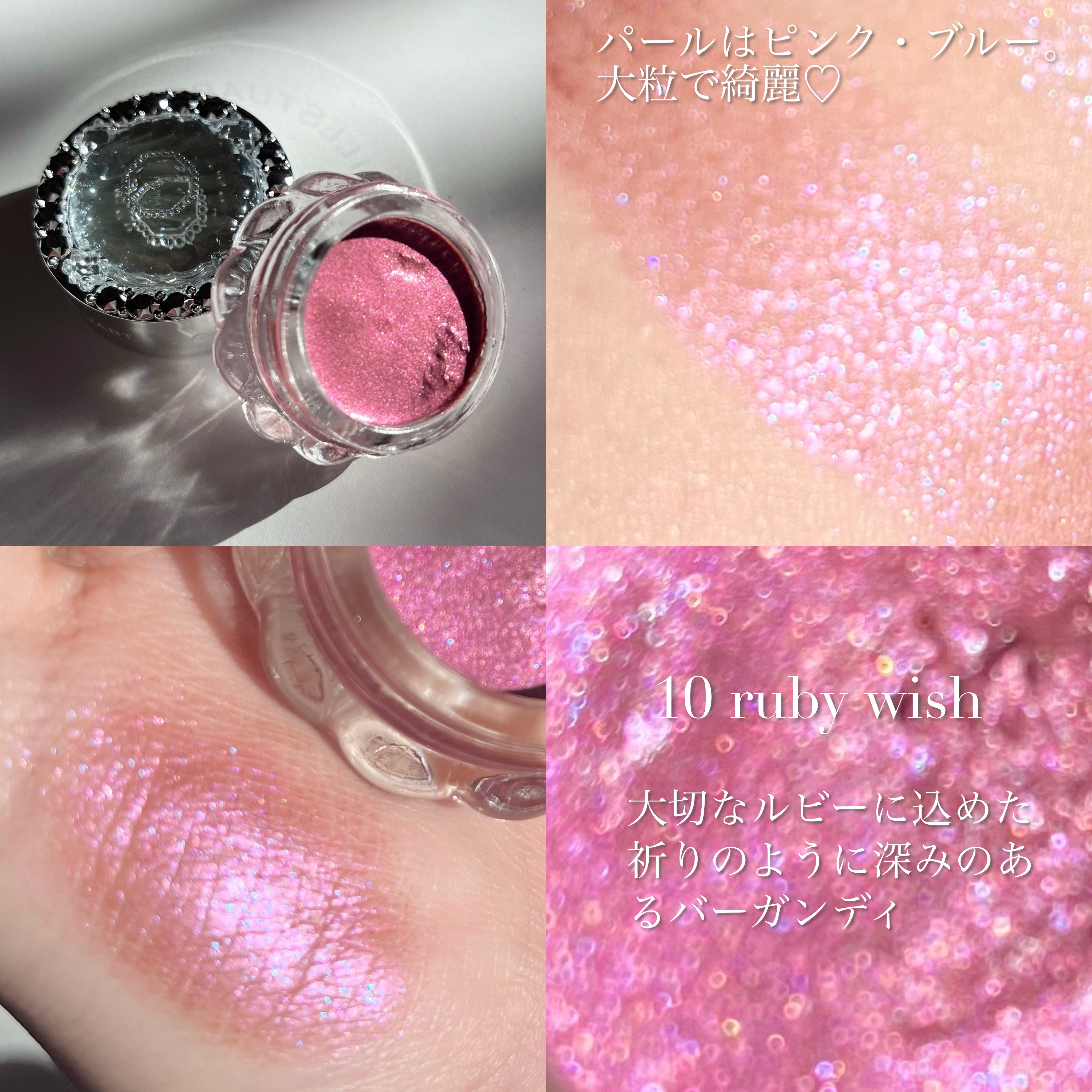 - <01 my pink diamond> 水、ホウケイ酸(Ca/Al)、合成フルオロフロゴパイト、BG、オクチルドデカノール、DPG、PEG-12ジメチコン、(ジビニルジメチコン/ジメチコン)コポリマー、アボカド油、アンズ核油、トコフェロール、ラベンダー油、ローズマリー葉エキス、AMP、PEG-60水添ヒマシ油、(C12,13)パレス-23、(C12,13)パレス-3、(アクリレーツ/メタクリル酸ステアレス-20)コポリマー、アクリレーツコポリマーアンモニウム、カオリン、キサンタンガム、クエン酸、ケイ酸(Al/Mg)、シリカ、ミネラルオイル、ラウリル硫酸Na、酸化スズ、水酸化Al、水添ポリイソブテン、エチルパラベン、フェノキシエタノール、メチルパラベン、香料、グンジョウ、マイカ、酸化チタン、酸化鉄、赤226 <02 cinderella tiara> 水、ホウケイ酸(Ca/Al)、合成フルオロフロゴパイト、PET、BG、オクチルドデカノール、DPG、PEG-12ジメチコン、(ジビニルジメチコン/ジメチコン)コポリマー、アボカド油、アンズ核油、トコフェロール、ラベンダー油、ローズマリー葉エキス、AMP、PEG-60水添ヒマシ油、(C12,13)パレス-23、(C12,13)パレス-3、(アクリレーツ/メタクリル酸ステアレス-20)コポリマー、アクリレーツコポリマー、アクリレーツコポリマーアンモニウム、カオリン、キサンタンガム、クエン酸、ケイ酸(Al/Mg)、ミネラルオイル、ラウリル硫酸Na、酸化スズ、水酸化Al、水添ポリイソブテン、エチルパラベン、フェノキシエタノール、メチルパラベン、香料、グンジョウ、マイカ、酸化チタン、酸化鉄、赤226 <03 amethyst cloud> 水、ホウケイ酸(Ca/Al)、BG、オクチルドデカノール、DPG、PEG-12ジメチコン、合成フルオロフロゴパイト、シリカ、(ジビニルジメチコン/ジメチコン)コポリマー、アボカド油、アンズ核油、トコフェロール、ラベンダー油、ローズマリー葉エキス、AMP、PEG-60水添ヒマシ油、(C12,13)パレス-23、(C12,13)パレス-3、(アクリレーツ/メタクリル酸ステアレス-20)コポリマー、アクリレーツコポリマーアンモニウム、カオリン、キサンタンガム、クエン酸、ケイ酸(Al/Mg)、ミネラルオイル、ラウリル硫酸Na、酸化スズ、水酸化Al、水添ポリイソブテン、エチルパラベン、フェノキシエタノール、メチルパラベン、香料、グンジョウ、酸化チタン、酸化鉄、赤226 <04 twinkle gold> 水、合成フルオロフロゴパイト、ホウケイ酸(Ca/Al)、BG、オクチルドデカノール、DPG、PEG-12ジメチコン、(ジビニルジメチコン/ジメチコン)コポリマー、アボカド油、アンズ核油、トコフェロール、ラベンダー油、ローズマリー葉エキス、AMP、PEG-60水添ヒマシ油、(C12,13)パレス-23、(C12,13)パレス-3、(アクリレーツ/メタクリル酸ステアレス-20)コポリマー、アクリレーツコポリマーアンモニウム、キサンタンガム、クエン酸、ケイ酸(Al/Mg)、ミネラルオイル、ラウリル硫酸Na、酸化スズ、水酸化Al、水添ポリイソブテン、エチルパラベン、フェノキシエタノール、メチルパラベン、香料、マイカ、酸化チタン、酸化鉄 <05 prism coral> 水、合成フルオロフロゴパイト、ホウケイ酸(Ca/Al)、BG、オクチルドデカノール、DPG、PEG-12ジメチコン、(ジビニルジメチコン/ジメチコン)コポリマー、アボカド油、アンズ核油、トコフェロール、ラベンダー油、ローズマリー葉エキス、AMP、PEG-60水添ヒマシ油、(C12,13)パレス-23、(C12,13)パレス-3、(アクリレーツ/メタクリル酸ステアレス-20)コポリマー、アクリレーツコポリマーアンモニウム、キサンタンガム、クエン酸、ケイ酸(Al/Mg)、シリカ、ミネラルオイル、ラウリル硫酸Na、酸化スズ、水酸化Al、水添ポリイソブテン、エチルパラベン、フェノキシエタノール、メチルパラベン、香料、マイカ、酸化チタン、酸化鉄、赤226 <06 antique bijou> 水、ホウケイ酸(Ca/Al)、合成フルオロフロゴパイト、BG、オクチルドデカノール、DPG、PEG-12ジメチコン、(ジビニルジメチコン/ジメチコン)コポリマー、アボカド油、アンズ核油、トコフェロール、ラベンダー油、ローズマリー葉エキス、AMP、PEG-60水添ヒマシ油、(C12,13)パレス-23、(C12,13)パレス-3、(アクリレーツ/メタクリル酸ステアレス-20)コポリマー、アクリレーツコポリマーアンモニウム、キサンタンガム、クエン酸、ケイ酸(Al/Mg)、シリカ、ミネラルオイル、ラウリル硫酸Na、酸化スズ、水酸化Al、水添ポリイソブテン、エチルパラベン、フェノキシエタノール、メチルパラベン、香料、マイカ、銀、酸化チタン、酸化鉄 <07 topaz sunrise> 水、合成フルオロフロゴパイト、ホウケイ酸(Ca/Al)、BG、オクチルドデカノール、DPG、PEG-12ジメチコン、(ジビニルジメチコン/ジメチコン)コポリマー、アボカド油、アンズ核油、トコフェロール、ラベンダー油、ローズマリー葉エキス、AMP、PEG-60水添ヒマシ油、(C12,13)パレス-23、(C12,13)パレス-3、(アクリレーツ/メタクリル酸ステアレス-20)コポリマー、アクリレーツコポリマーアンモニウム、キサンタンガム、クエン酸、ケイ酸(Al/Mg)、シリカ、ミネラルオイル、ラウリル硫酸Na、酸化スズ、水酸化Al、水添ポリイソブテン、エチルパラベン、フェノキシエタノ