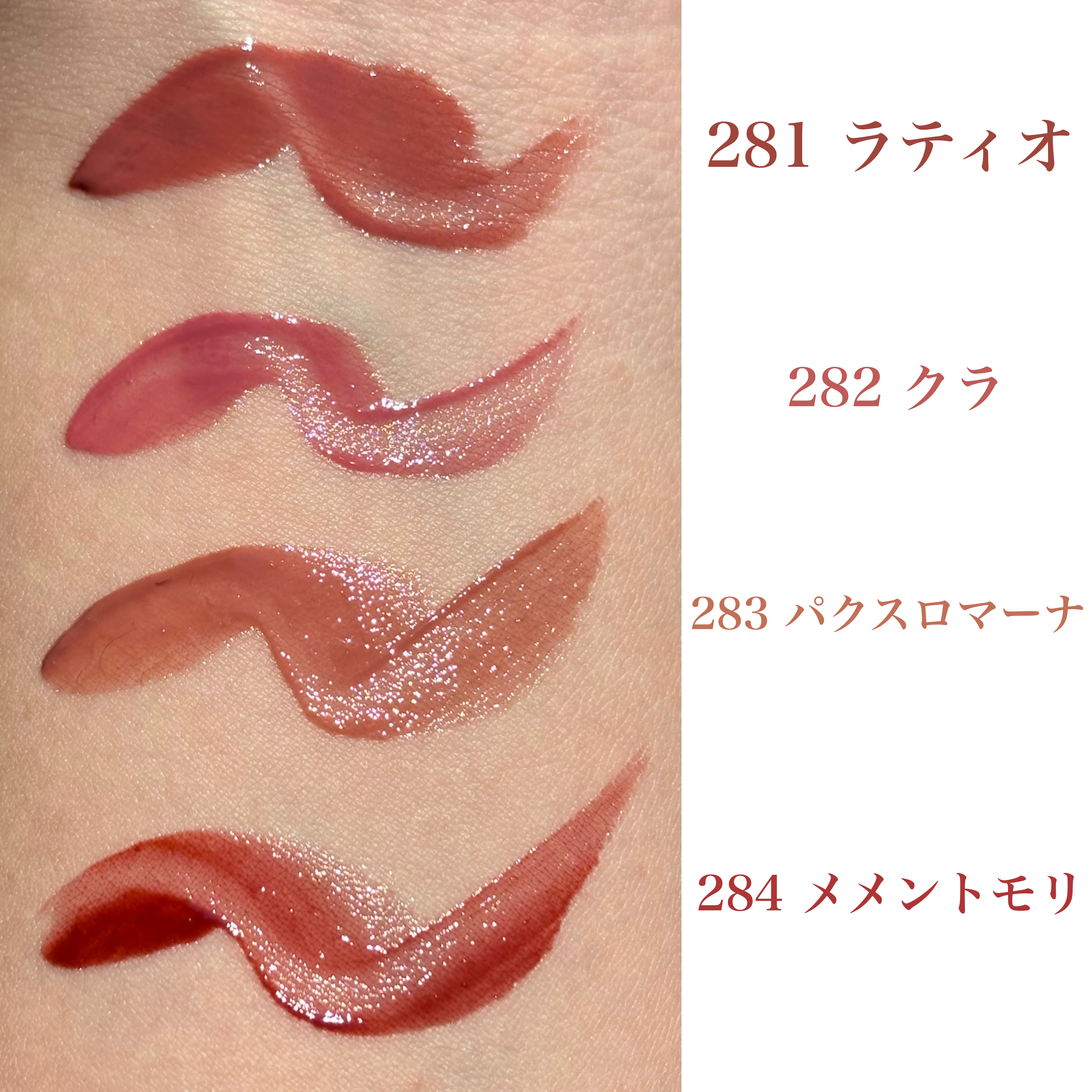 - <201 ノビリタス> 水、ジフェニルジメチコン、リンゴ酸ジイソステアリル、ビスジグリセリルポリアシルアジペート-2、オクチルドデカノール、水添ポリイソブテン、トリメチルシロキシフェニルジメチコン、ジグリセリン、セチルPEG/PPG-10/1ジメチコン、DPG、ポリソルベート60、イソステアリン酸ソルビタン、ペンチレングリコール、(アクリル酸ヒドロキシエチル/アクリロイルジメチルタウリンNa)コポリマー、セテアリルアルコール、スクワラン、酸化チタン、黄4、赤227、エチルヘキシルグリセリン、安息香酸ベンジル、黄5、香料、水酸化Al、ポリアクリル酸アンモニウム、リナロール、フェノキシエタノール、BG、塩化Na、青1、ヘキシルシンナマル、トコフェロール <202 ソフィア> 水、ジフェニルジメチコン、リンゴ酸ジイソステアリル、オクチルドデカノール、水添ポリイソブテン、トリメチルシロキシフェニルジメチコン、ジグリセリン、DPG、セチルPEG/PPG-10/1ジメチコン、ポリソルベート60、イソステアリン酸ソルビタン、ペンチレングリコール、(アクリル酸ヒドロキシエチル/アクリロイルジメチルタウリンNa)コポリマー、セテアリルアルコール、スクワラン、酸化チタン、黄5、赤227、エチルヘキシルグリセリン、安息香酸ベンジル、香料、リナロール、水酸化Al、ポリアクリル酸アンモニウム、青1、BG、フェノキシエタノール、ヘキシルシンナマル、トコフェロール <203 ディビニタス> 水、ジフェニルジメチコン、リンゴ酸ジイソステアリル、ビスジグリセリルポリアシルアジペート-2、オクチルドデカノール、水添ポリイソブテン、トリメチルシロキシフェニルジメチコン、ジグリセリン、セチルPEG/PPG-10/1ジメチコン、DPG、ポリソルベート60、イソステアリン酸ソルビタン、ペンチレングリコール、(アクリル酸ヒドロキシエチル/アクリロイルジメチルタウリンNa)コポリマー、セテアリルアルコール、スクワラン、酸化チタン、黄5、赤227、エチルヘキシルグリセリン、安息香酸ベンジル、香料、水酸化Al、ポリアクリル酸アンモニウムリナロール、青1、フェノキシエタノール、BG、ヘキシルシンナマル、トコフェロール <204 モデスティア> 水、ジフェニルジメチコン、リンゴ酸ジイソステアリル、オクチルドデカノール、ビスジグリセリルポリアシルアジペート-2、水添ポリイソブテン、トリメチルシロキシフェニルジメチコン、ジグリセリン、DPG、セチルPEG/PPG-10/1ジメチコン、ポリソルベート60、イソステアリン酸ソルビタン、ペンチレングリコール、(アクリル酸ヒドロキシエチル/アクリロイルジメチルタウリンNa)コポリマー、セテアリルアルコール、スクワラン、酸化チタン、黄5、赤104(1)、赤227、エチルヘキシルグリセリン、安息香酸ベンジル、香料、青1、水酸化Al、ポリアクリル酸アンモニウム、リナロール、フェノキシエタノール、BG、ヘキシルシンナマル、トコフェロール <205 ユスティティア> 水、ジフェニルジメチコン、リンゴ酸ジイソステアリル、ビスジグリセリルポリアシルアジペート-2、オクチルドデカノール、水添ポリイソブテン、トリメチルシロキシフェニルジメチコン、ジグリセリン、セチルPEG/PPG-10/1ジメチコン、DPG、ポリソルベート60、イソステアリン酸ソルビタン、ペンチレングリコール、(アクリル酸ヒドロキシエチル/アクリロイルジメチルタウリンNa)コポリマー、セテアリルアルコール、スクワラン、酸化チタン、黄4、赤227、エチルヘキシルグリセリン、安息香酸ベンジル、黄5、香料、水酸化Al、ポリアクリル酸アンモニウム、リナロール、フェノキシエタノール、BG、塩化Na、青1、ヘキシルシンナマル、トコフェロール <206 グラティア> 水、ジフェニルジメチコン、リンゴ酸ジイソステアリル、ビスジグリセリルポリアシルアジペート-2、オクチルドデカノール、水添ポリイソブテン、トリメチルシロキシフェニルジメチコン、ジグリセリン、セチルPEG/PPG-10/1ジメチコン、DPG、ポリソルベート60、イソステアリン酸ソルビタン、ペンチレングリコール、(アクリル酸ヒドロキシエチル/アクリロイルジメチルタウリンNa)コポリマー、セテアリルアルコール、スクワラン、酸化チタン、黄4、赤227、エチルヘキシルグリセリン、安息香酸ベンジル、黄5、香料、水酸化Al、ポリアクリル酸アンモニウム、リナロール、フェノキシエタノール、BG、塩化Na、青1、ヘキシルシンナマル、トコフェロール <213 リベルタス> 水、ジフェニルジメチコン、リンゴ酸ジイソステアリル、ビスジグリセリルポリアシルアジペート-2、オクチルドデカノール、水添ポリイソブテン、トリメチルシロキシフェニルジメチコン、ジグリセリン、DPG、セチルPEG/PPG-10/1ジメチコン、ポリソルベート60、イソステアリン酸ソルビタン、1,2-ヘキサンジオール、ペンチレングリコール、酸化チタン(CI 77891)、(アクリル酸ヒドロキシエチル/アクリロイルジメチルタウリンNa)コポリマー、セテアリルアルコール、スクワラン、黄5、エチルヘキシルグリセ