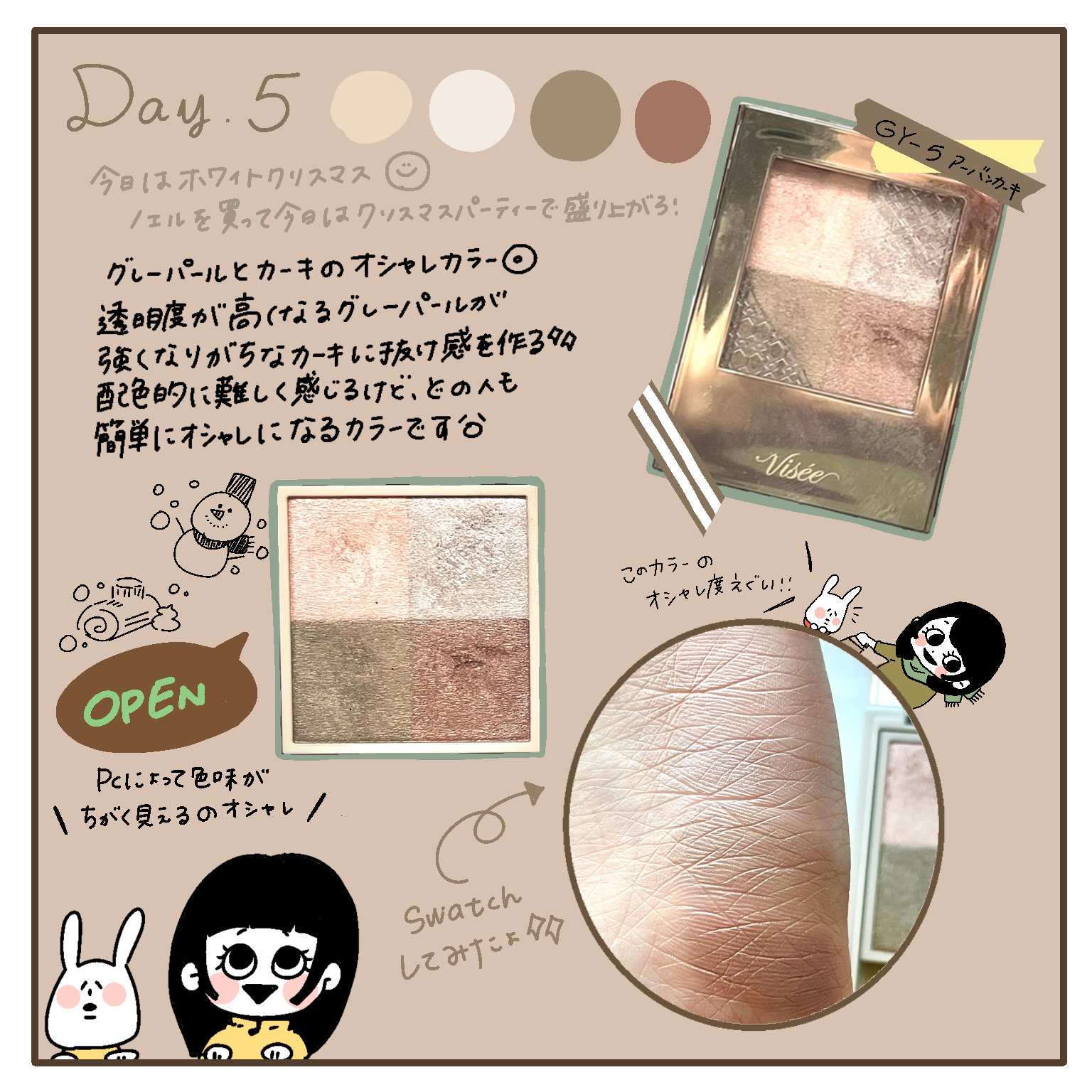 上品なツヤのアイシャドウ クールベージュ系 ツヤ感が綺麗なのでイエベ寄せのメイクのときに使いたいです。 全体的に上品なツヤで発色も良くて粉質もしっとりしていて良かったです。