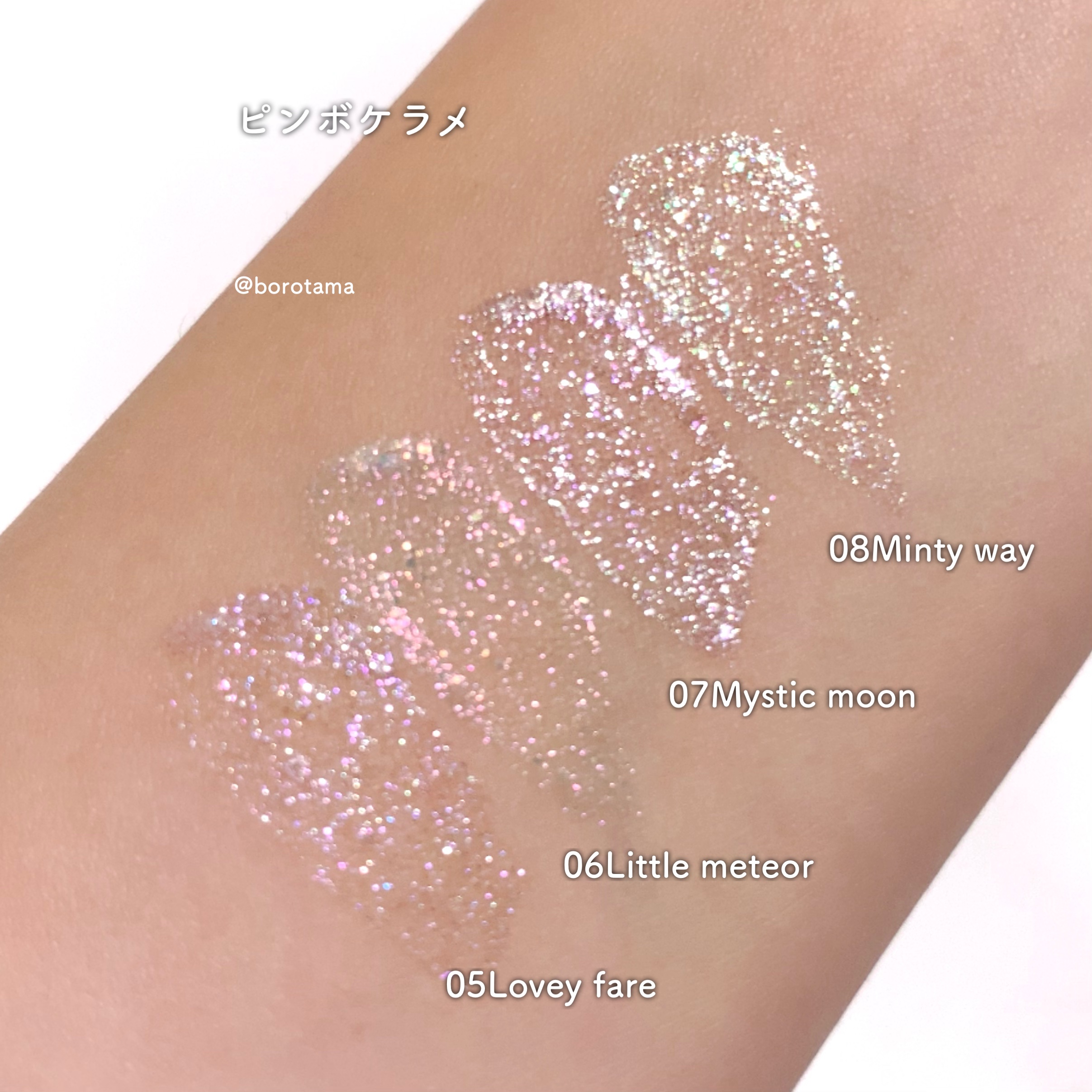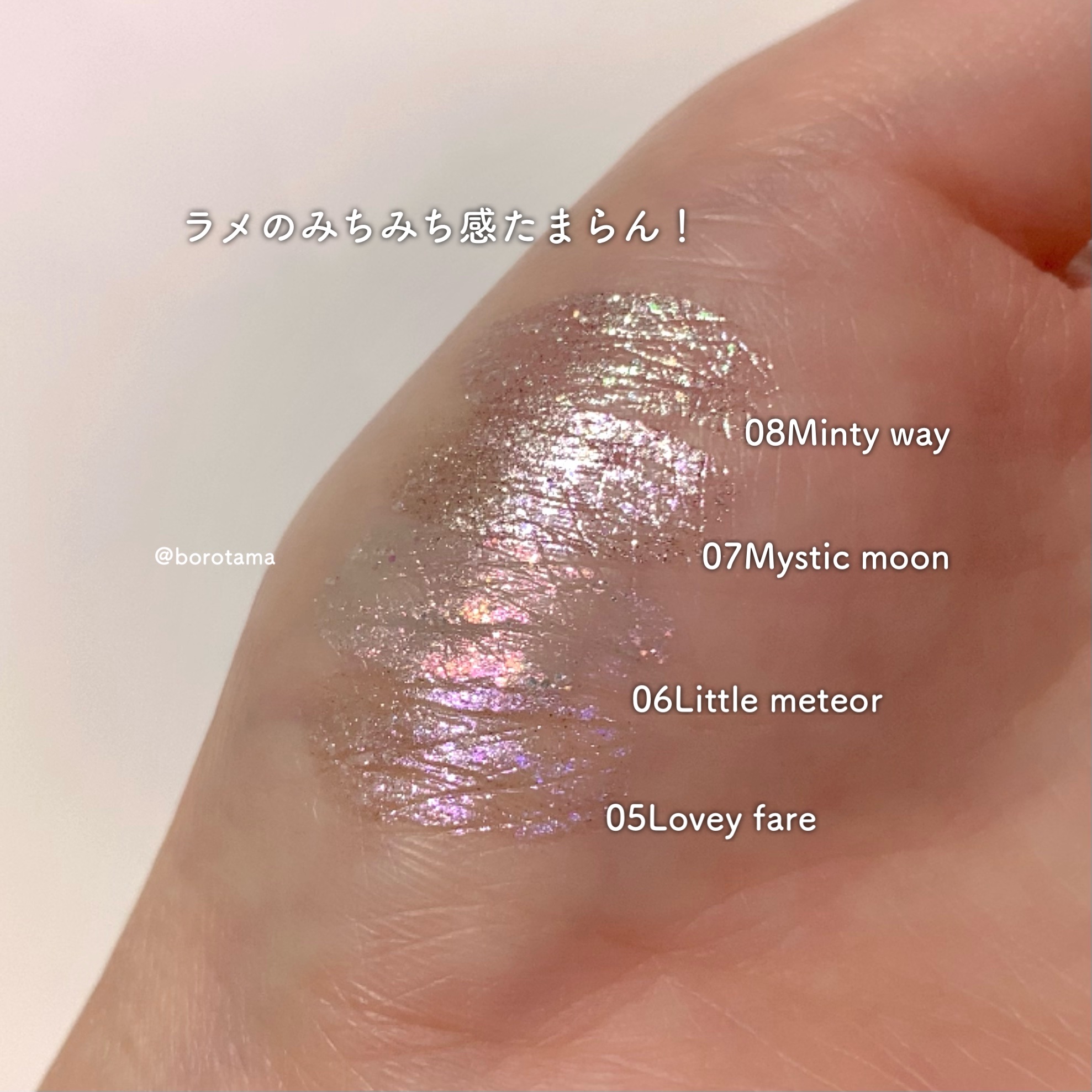 - <01 スターダスト(STARDUST)> 水、PET、ホ ウケイ酸(Ca/Al)、グリセリン、アクリレーツ コポリマー、ホウケイ酸( Ca/チタン)、1,2- ヘキサンジオール、(アク リル酸ヒドロキシエチル/ アクリロイルジメチルタウ リンNa)コポリマー、ス クワラン、AMP、エチル ヘキシルグリセリン、ポリ ソルベート60、イソステ アリン酸ソルビタン、トコ フェロール、カルボマー、酸化スズ、EDTA-2N a、フェノキシエタノール、銀、酸化チタン、(チタ ン/酸化チタン)焼結物、酸化鉄 <02 ローズスター(ROSE STAR)> 水、PET、ポリ ブチレンテレフタレート、ア クリレーツコポリマー、グリ セリン、ホウケイ酸(Ca/ Al)、(エチレン/VA) コポリマー、ホウケイ酸(C a/Na)、ホウケイ酸(C a/Al)、1,2-ヘキサ ンジオール、(アクリル酸ヒ ドロキシエチル/アクリロイ ルジメチルタウリンNa)コ ポリマー、スクワラン、AM P、エチルヘキシルグリセリ ン、シリカ、ポリソルベート 60、イソステアリン酸ソル ビタン、トコフェロール、カ ルボマー、EDTA-2Na、酸化スズ、フェノキシエタ ノール、酸化チタン、酸化鉄、マイカ 使用方法 <03 イブニングスター(EVENING STAR)> 水、PET、ポリ ブチレンテレフタレート、グ リセリン、アクリレーツコポ リマー、ホウケイ酸(Ca/ チタン)、(エチレン/VA )コポリマー、ホウケイ酸( Ca/Al)、1,2-ヘキ サンジオール、シリカ、(ア クリル酸ヒドロキシエチル/ アクリロイルジメチルタウリ ンNa)コポリマー、スクワ ラン、AMP、エチルヘキシ ルグリセリン、ポリソルベー ト60、イソステアリン酸ソ ルビタン、トコフェロール、カルボマー、EDTA-2N a、酸化スズ、フェノキシエ タノール、酸化鉄、酸化チタ ン、(チタン/酸化チタン) 焼結物 <04 フローズンスター(FROZEN STAR)> 水、PET、ポリ ブチレンテレフタレート、ア クリレーツコポリマー、グリ セリン、ホウケイ酸(Ca/ Al)、(エチレン/VA) コポリマー、1,2-ヘキサ ンジオール、(アクリル酸ヒ ドロキシエチル/アクリロイ ルジメチルタウリンNa)コ ポリマー、スクワラン、AM P、エチルヘキシルグリセリ ン、ホウケイ酸(Ca/チタ ン)、シリカ、ポリソルベー ト60、イソステアリン酸ソ ルビタン、トコフェロール、カルボマー、EDTA-2N a、酸化スズ、フェノキシエ タノール、酸化チタン、酸化 鉄、マイカ、(チタン/酸化 チタン)焼結物 <05 ラビーフレア(LOVEY FLARE)> 水、PET、ホウケイ酸(Ca/Al)、グリセリン、ホウケイ酸(Ca/チタン)、酸化チタン、アクリレーツコポリマー、PVP、1,2-ヘキサンジオール、シリカ、カルボマー、フェノキシエタノール、(アクリル酸ヒドロキシエチル/アクリロイルジメチルタウリンNa)コポリマー、スクワランAMP、エチルヘキシルグリセリン、酸化スズ、酸化鉄、EDTA-2Na、マイカ、ポリソルベート60、BG、ペンチレングリコール、ダイズ種子エキス、イソステアリン酸ソルビタン、アセチルグルコサミン、ヒアルロン酸Na、フナバラソウエキス、ヒドロキシアセトフェノン、オクタンジオール、タチアオイ花エキス、ヒアルロン酸クロスポリマーNa、トコフェロール、カプリリルグリコール <06 リトルメテオ(LTTLE METEOR)> 水、PET、ホウケイ酸(Ca/Al)、ホウケイ酸(Ca/チタン)、グリセリン、酸化チタン、アクリレーツコポリマー、PVP、1,2-ヘキサンジオール、シリカ、合成フルオロフロゴパイト、カルボマー、フェノキシエタノール、(アクリル酸ヒドロキシエチル/アクリロイルジメチルタウリンNa)コポリマー、スクワラン、AMP、エチルヘキシルグリセリン、酸化スズ、EDTA-2Na、ポリソルベート60、BG、ペンチレングリコール、ダイズ種子エキス、イソステアリン酸ソルビタン、アセチルグルコサミン、ヒアルロン酸Na、フナバラソウエキス、ヒドロキシアセトフェノン、オクタンジオール、タチアオイ花エキス、ヒアルロン酸クロスポリマーNa、トコフェロール、カプリリルグリコール <07 ミスティックムーン(MYSTIC MOON)> 水、PET、ホウケイ酸(Ca/Al)、グリセリン、ホウケイ酸(Ca/チタン)、酸化チタン、アクリレーツコポリマー、PVP、1,2-ヘキサンジオール、シリカ、カルボマー、フェノキシエタノール、(アクリル酸ヒドロキシエチル/アクリロイルジメチルタウリンNa)コポリマー、スクワラン、AMP、マイカ、エチルヘキシルグリセリン、酸化スズ、酸化鉄、EDTA-2Na、ポリソルベート60、BG、ペンチレングリコール、ダイズ種子エキス、イソステアリン酸ソルビタン、アセチルグルコサミン、ヒアルロン酸Na、コンジョウ、フナバラソウエキス、ヒドロキシアセトフェノン、オクタンジオール、タチアオイ花エキス、ヒアルロン酸クロスポリマーNa、トコフェロール、カプリリルグリコール <08 ミンティウェイ(MINTY WAY)> 水、PET、ホウケイ酸(Ca/Al)、グリセリン、酸化チタン、アクリレーツコポリマー、PVP、合成フルオロフロゴパイト、1,2-ヘキサンジオール、ホウケイ酸(Ca/チタン)、カルボマー、フェノキシエタノール、(アクリル酸ヒドロキシエチル/アクリロイルジメチルタウリンNa)コポリマー、シリカ、スクワラン、AMP、エチルヘキシルグリセリン、EDTA-2