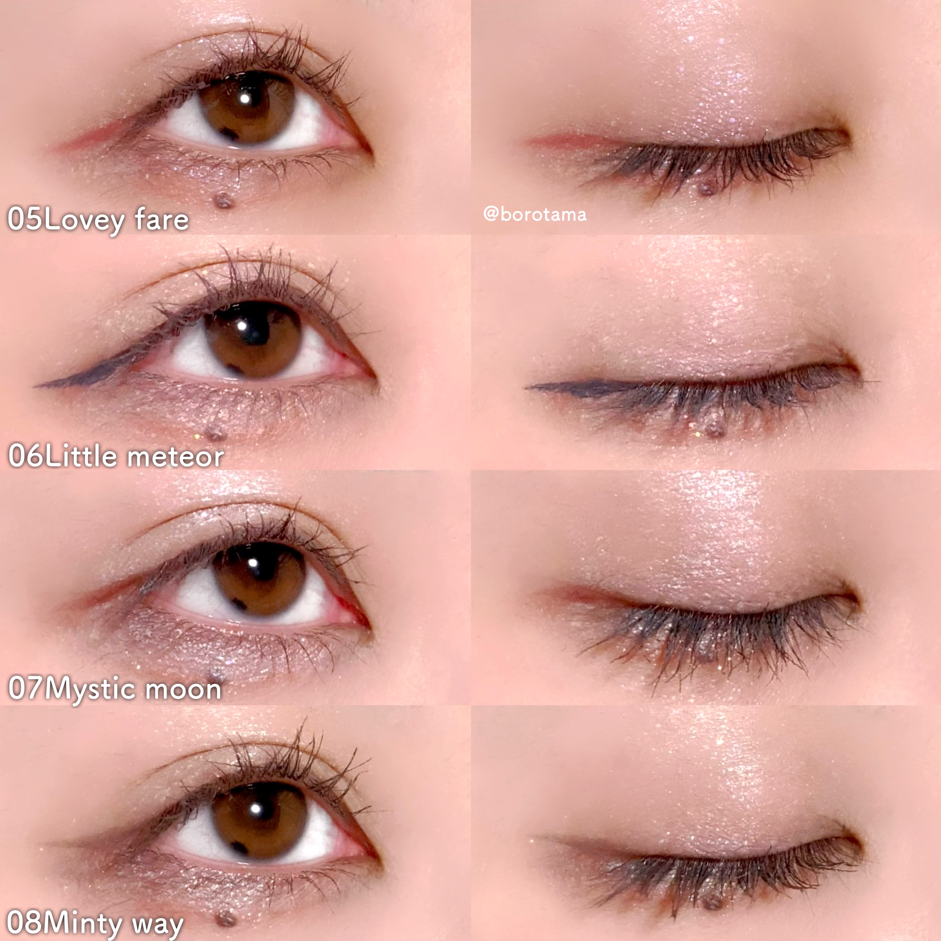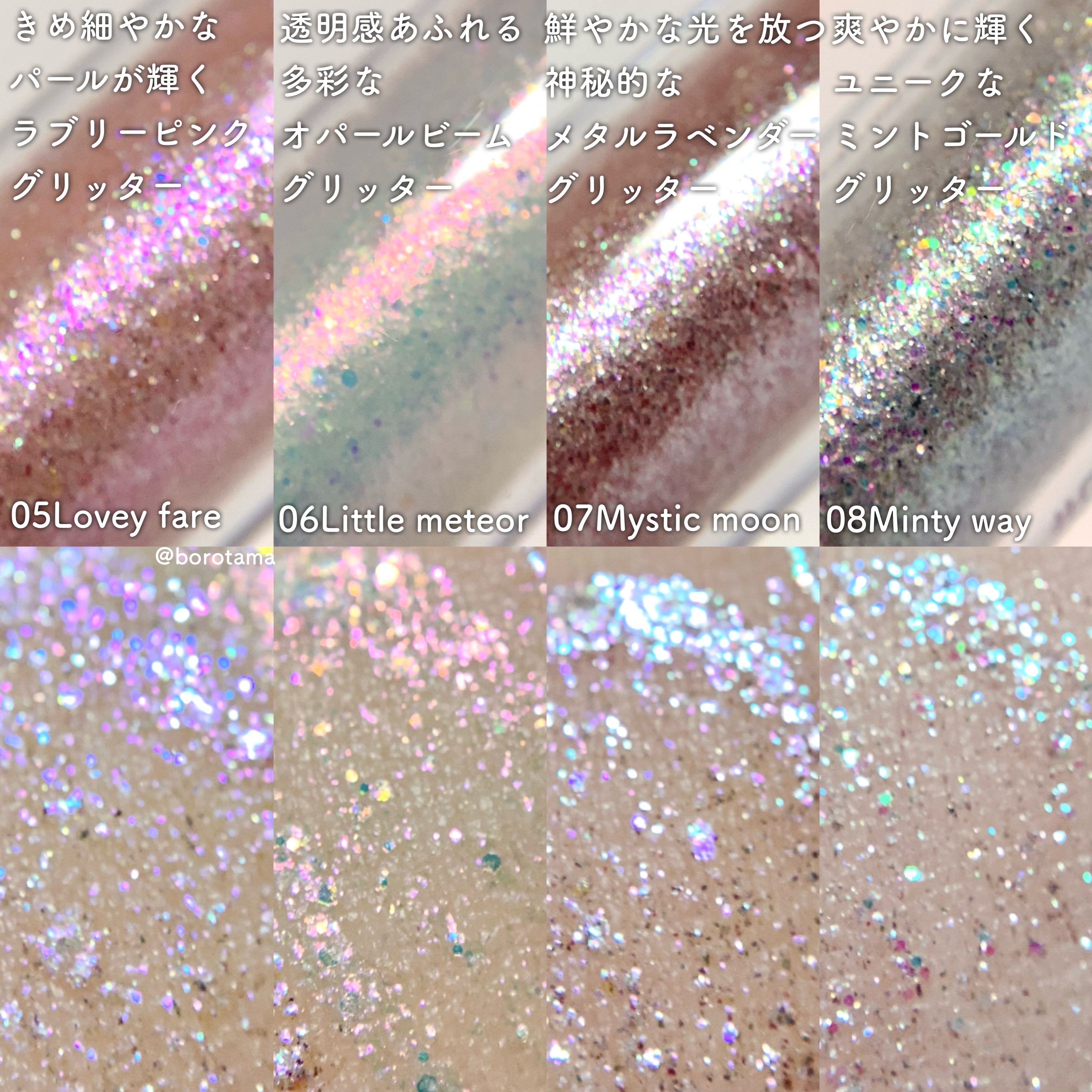 - ココロ踊るプリズムアイ ①様々な粒子を黄金比率で構成 ②長時間輝きを維持 ③使いやすい弾力のあるチップ <05~08> rom&ndが「ジューシーラスティングティント」に次いで日本へ展開したアイテムのひとつである「リキッドグリッターシャドウ」。 発売以来、160万本(*1)を超える実績を持つ定番人気商品ですが、このたび新たに4色を発売します。 既存カラーと比較すると、ラメはより繊細に、色味も淡めのニュアンスカラーになりました。 冬の空にかかるオーロラのように、多彩な表情を目もとにプラスします。 既存カラーと合わせて全8色、その日のメイクに合わせてお選びいただけます。 *1…2020年4月~2023年11月の出荷本数(当社データより)