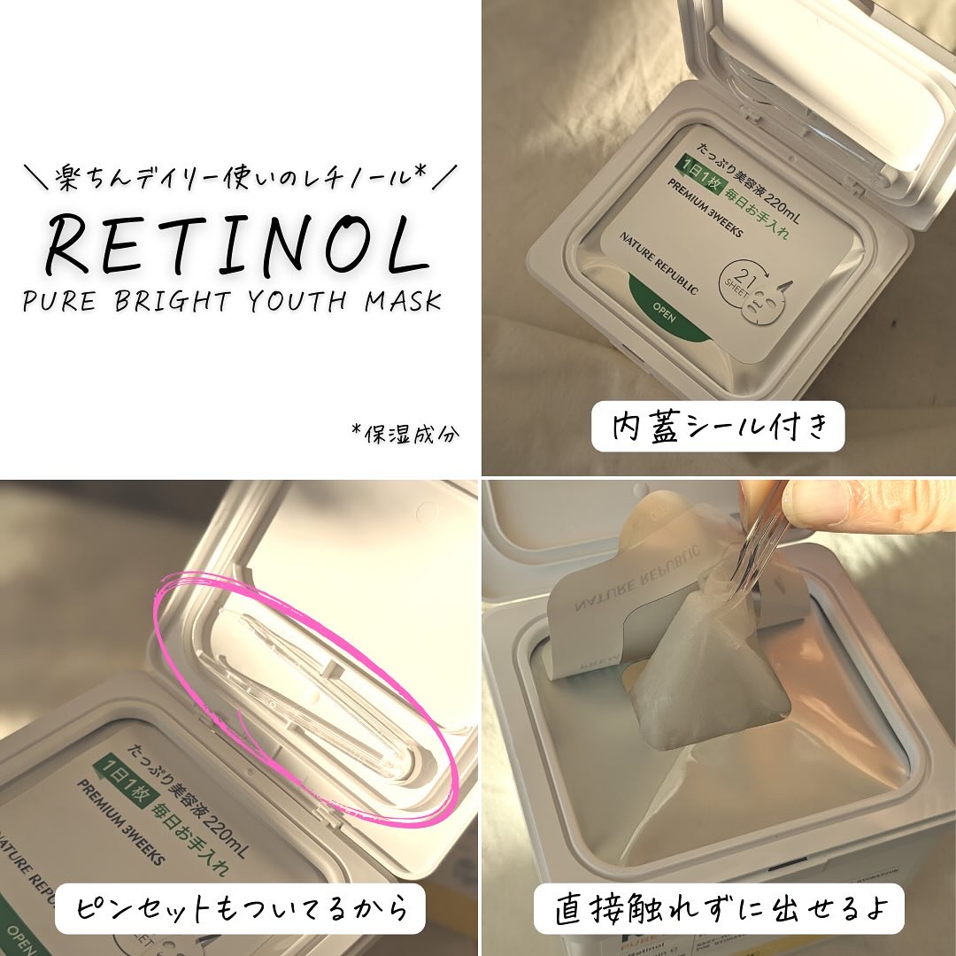 NATUREREPUBLICレチノールピュアブライトユースシートマスク パンテノールハイドラバランスシートマスクプロポリスインテンシブナリシングシートマスク内容量▷▶21枚入り販売価格▶各1,870円(税込)𓈒𓏸𓐍𓂃𓈒𓏸𓂃◌𓈒𓐍𓈒𓈒𓏸𓐍𓂃𓈒𓏸...