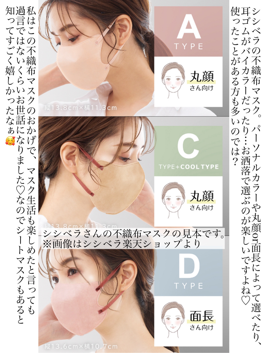 - 肌荒れ予防タイプ「VC100*1×CICA*2」 肌トラブル*3に適したタイプ。ニキビなどの肌荒れ*3に効果的なCICA成分配合で、さっぱりとした使用感が特徴的です。高保湿ながらもベタつきが気にならず、脂性肌の方におすすめです。 100%国産のシート使用で化学香料不使用(香りは爽やかなレモングラス)。敏感肌の方でも安心してご使用いただけます。 *1:アスコルビルグルコシド.アスコルビルリン酸Na.パルミチン酸.アスコルビルリン酸3Na.テトラヘキシルデカン酸アスコルビル *2:ツボクサエキス *3:マスク着用による肌乾燥のこと