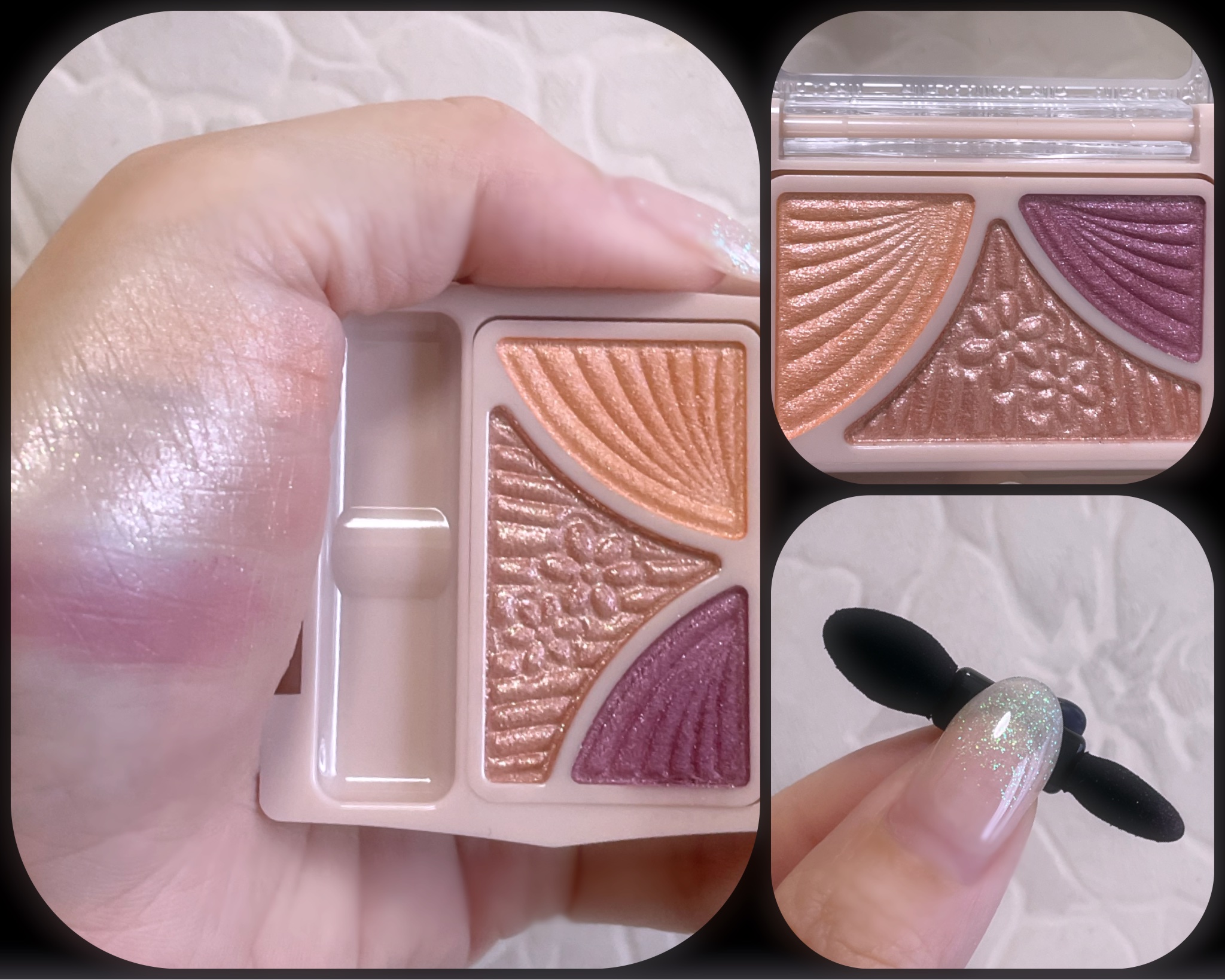 - パウダーなのにみずみずしい♥ 自然な立体感をつくりだす3色アイシャドウパレット 仕上げのコートで、ジューシー感&モチUP! メインカラー&ラインカラーはフィッティングオイル配合のしっとりパウダーで、 まぶたに吸いつくように溶け込み、ジューシーコートスフレで覆うことによって、 濡れたようにツヤめく愛されまぶたで透明感のある目元を演出します。