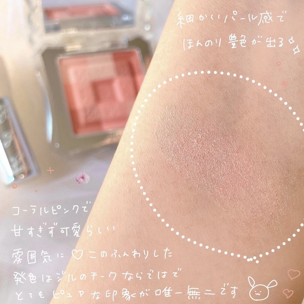 メイクの初心者さんにもおすすめできるくらいのベーシックで遊びごころも出せて本当に使い勝手の良いパレットです ✧ このカラーは絶妙に目ヂカラをアップしてデカ目に見せてくれます 𖧷 どんなメイクにも、どんな年齢のかたも使いやすいチークだと思います ˊᵕˋ 少し艶があって唇のフチを指でぼかすとナチュラルにメイク全体になじみます ⸝⋆