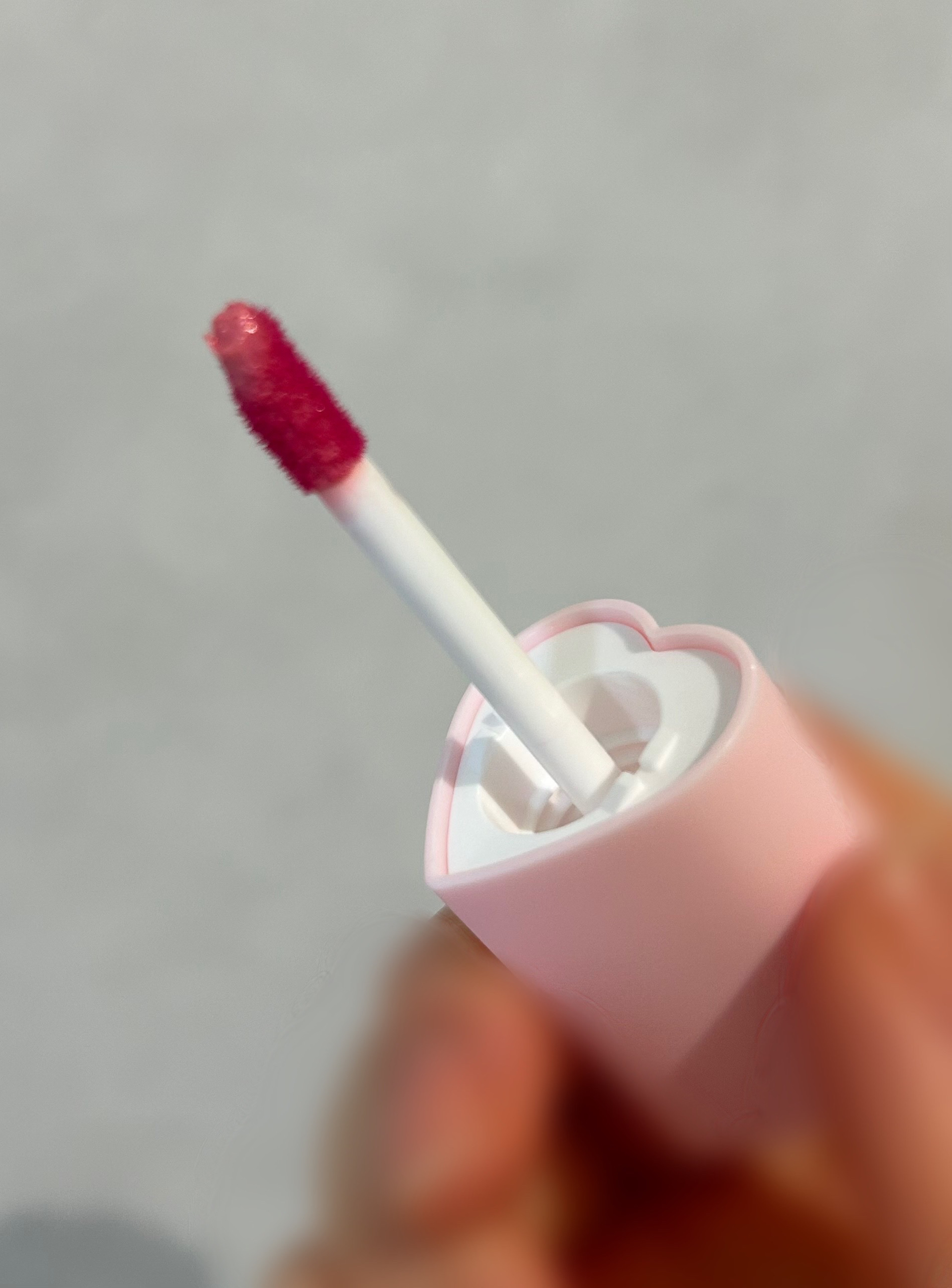 まずパケがハート型♡これで心が奪われます✨ 色は少し白みの入ったイチゴミルクカラー🍓 めちゃくちゃカワイイ!! サラッとしたテクスチャーなので、ツヤ感はナチュラル。