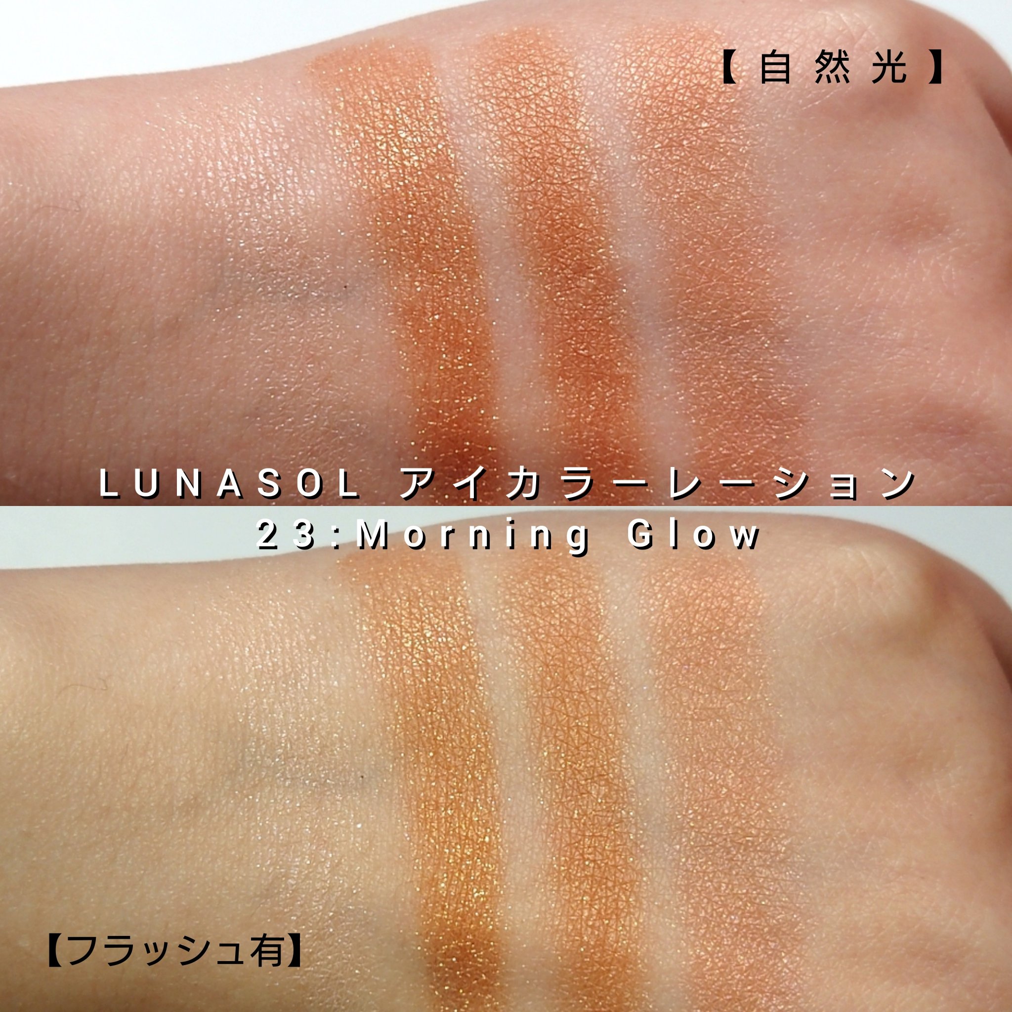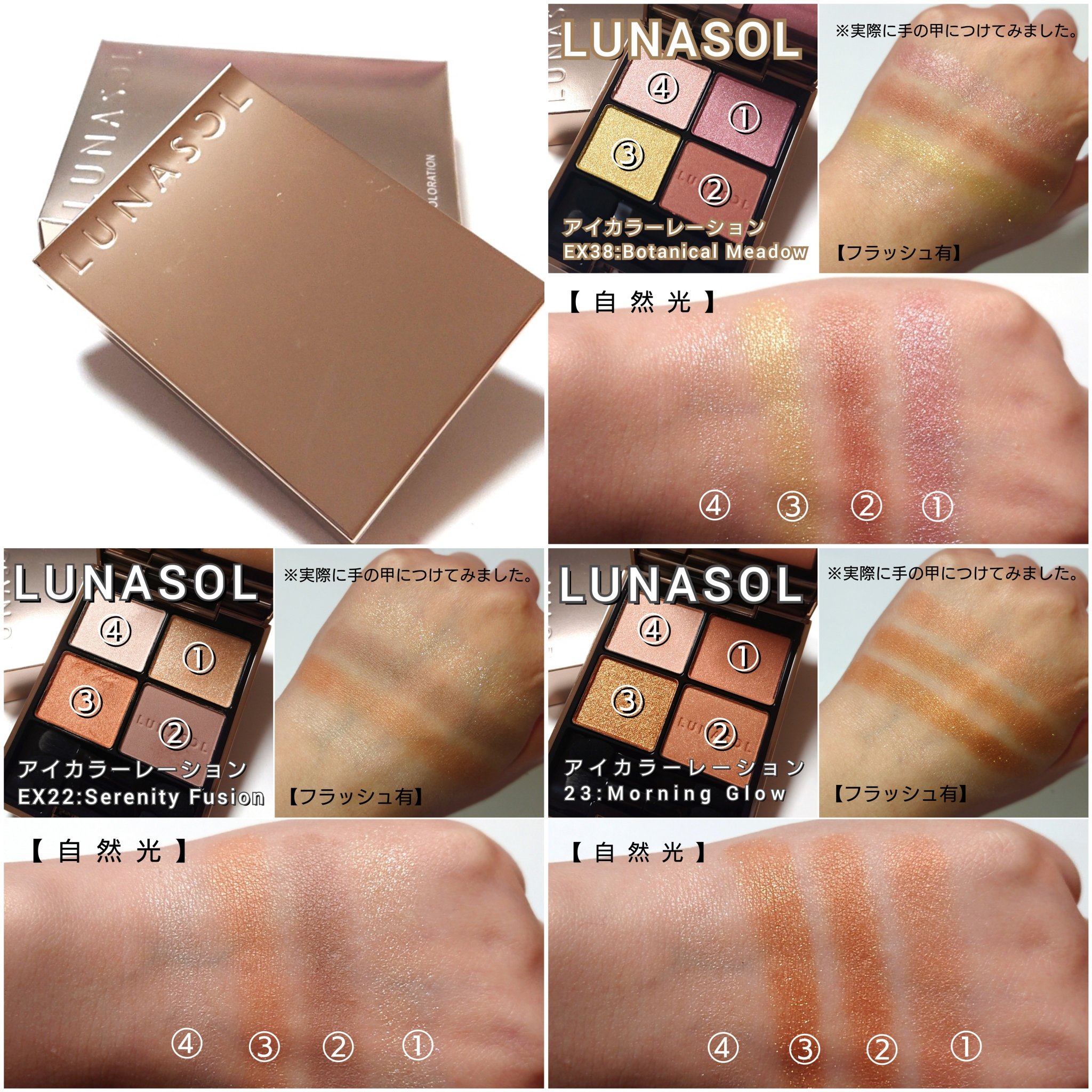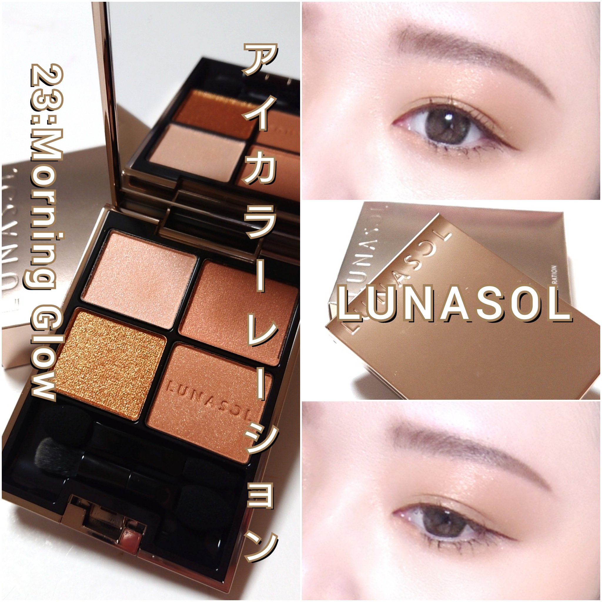 LUNASOLEYECOLORATION23MorningGlow旧製品から愛用中のMorningGlow。(左上)微細なゴールド・シルバーラメの煌めくピーチベージュ(右上)ほんのり光沢感のあるくすみピーチピンク(左下)ゴールドラメがゴージャ...