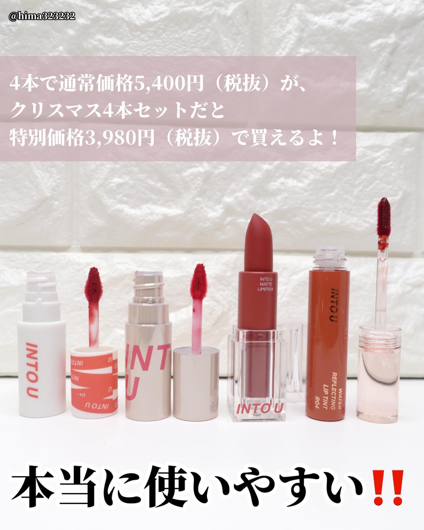 中国コスメブランド『INTO U』のバズりにバズった泥リップから特選ミニリップセットが数量限定で発売されるから紹介していくよ❣️ イエベ向きのウォームトーンセットとブルベ向きのクールトーンセットの2種類が登場するんだって😳✨ 可愛らしい見た目にほんのり香るチョコレートが魅力だよ🥰