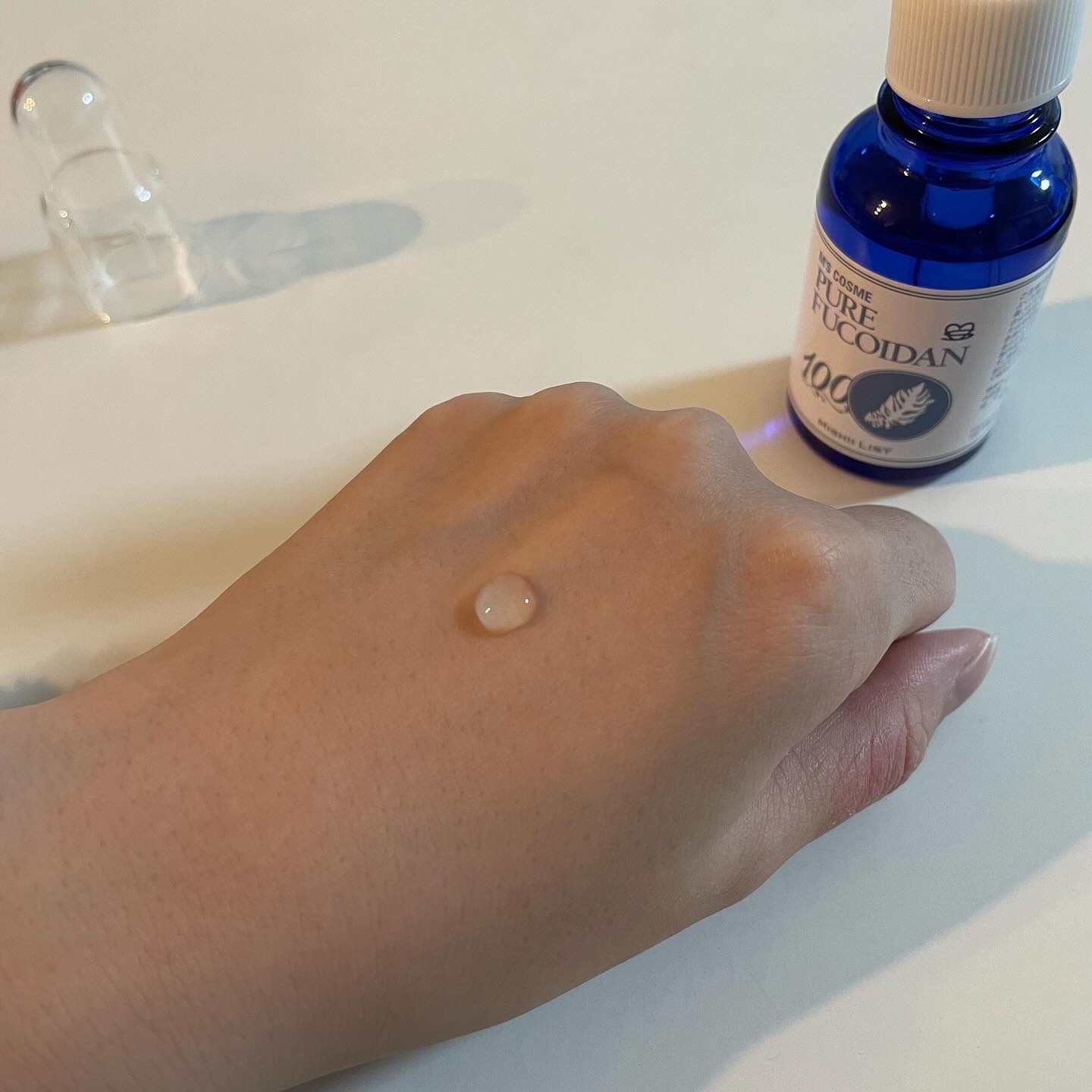 浸透力が高く、肌に潤いを与える希少成分であるフコイダン原液を100%使用してあります。 洗顔後、初めに付ける美容液。とろみがあるけど、お肌に馴染みやすく塗った後はもちっとした肌触りに。 いつものスキンケアにプラスして使えるのも◎