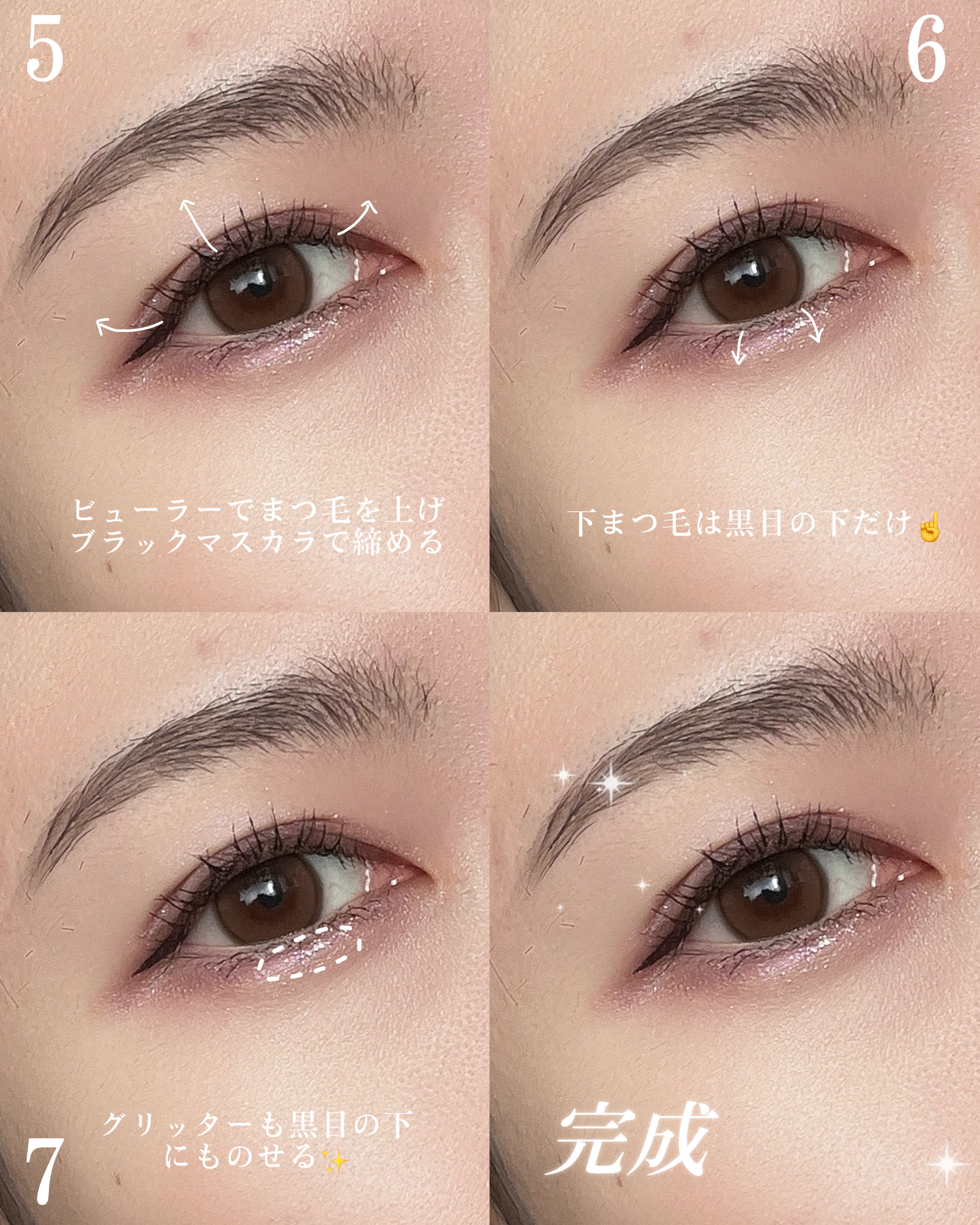 今日はアイシャドウ2つを使って初めてしたメイクです𓍯𓈒𓂂 𓈒 涙袋にジューシーピュアアイズ12の左のピンクをチップでたっぷり乗せるとぷっくり感がでるよ⟡.· このメイクのポイントは④のキラキララメを目頭と目尻の下にラメを付けるところです⟡.·