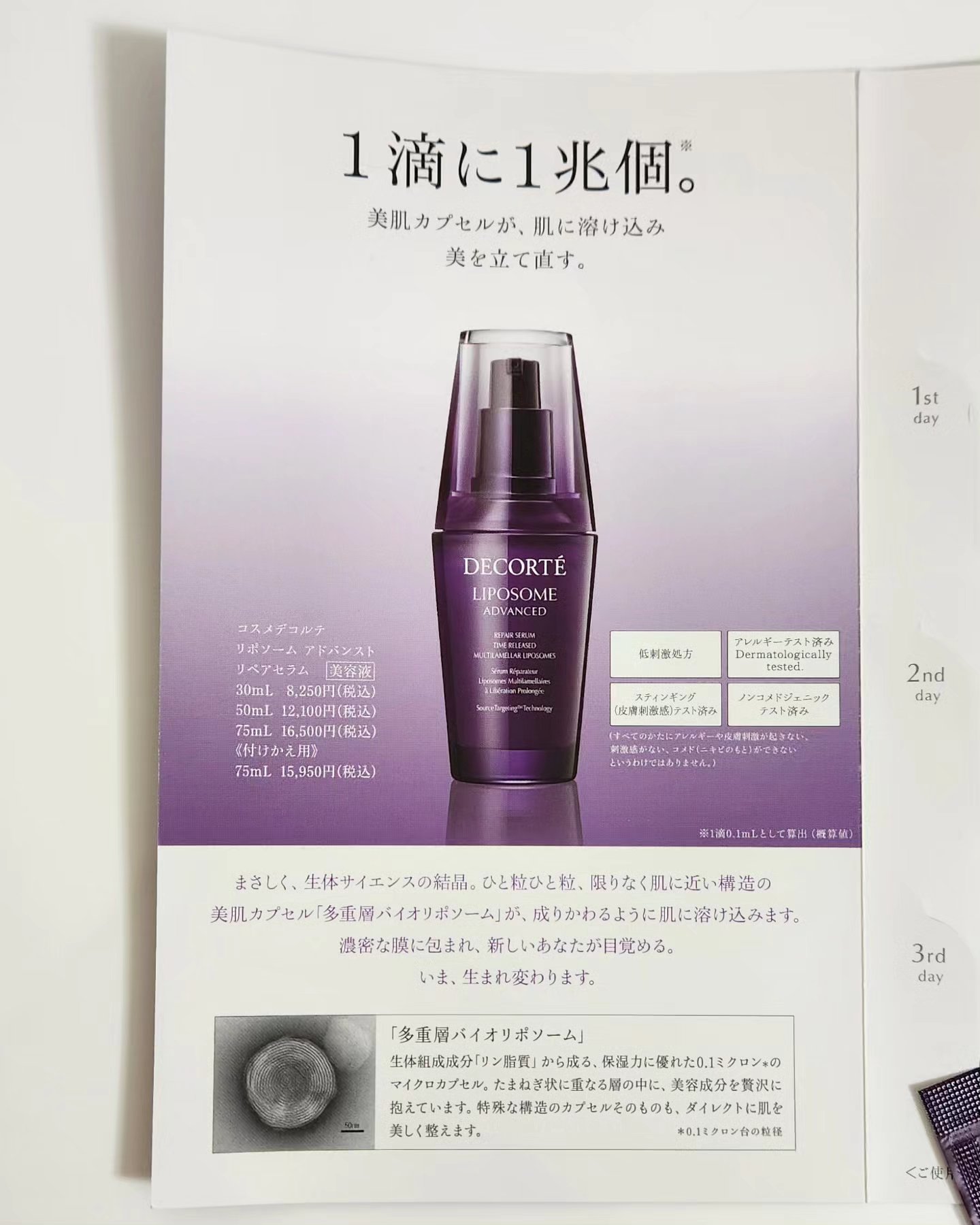 DECORTÉリポソームアドバンスト リペアセラムサンプル 1回分 0.8mL1回分と書いてありますが2回に分けて使用しました。使用するタイミングは、「洗顔後すぐ」です。普段他のブランドのスキンケアを使っている私は洗顔→リペアセラム→化粧水→...