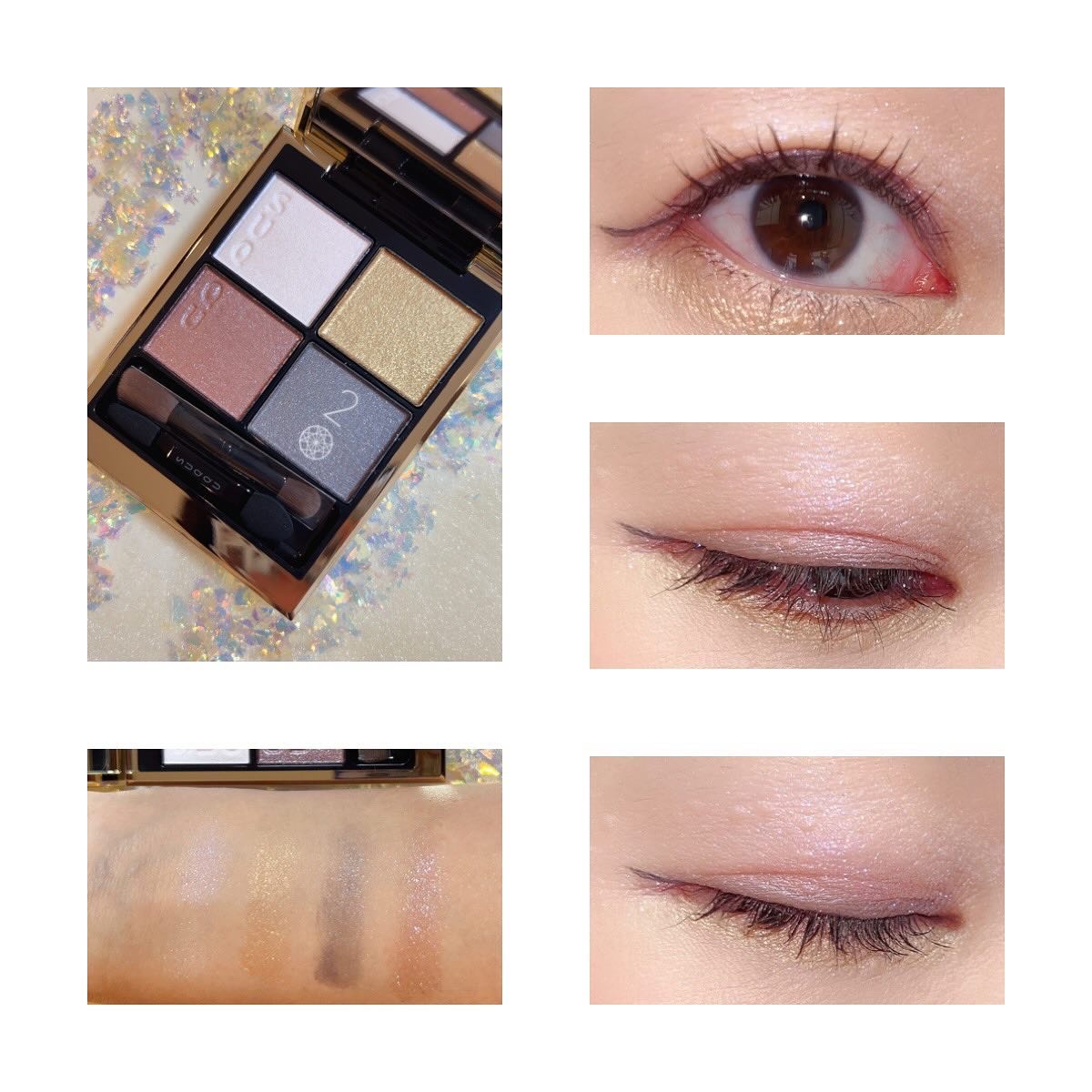 春カラーが好き🌸 春シーズンは欲しいものがたくさんでした。 左下のラメが繊細で綺麗✨ 公式通り、右上&左下をアイホール&下瞼、右下を目の際、左上をアイホールに重ねて。 アプリコット&ピスタチオというオシャレカラーで、繊細なラメ入り。 色持ちはよくて、食事後もしっかり色残りアリ。 縦皺も気にならないし、多分他のカラーも追加購入していくんだろうなぁ…🤣