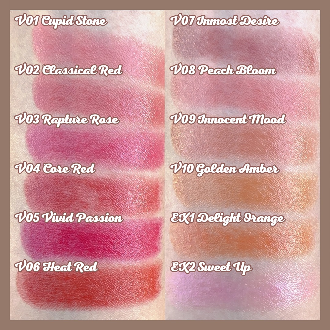 - <EX3 Cranberry Drop> 水添ポリイソブテン、ラウロイルグルタミン酸ジ(フィトステリル/オクチルドデシル)、トリ(カプリル酸/カプリン酸)グリセリル、ラウロイルグルタミン酸ジ(オクチルドデシル/フィトステリル/ベヘニル)、イソノナン酸イソトリデシル、ダイマージリノール酸(フィトステリル/イソステアリル/セチル/ステアリル/ベヘニル)、パラフィン、ポリエチレン、オクチルドデカノール、マイクロクリスタリンワックス、水添マイクロクリスタリンワックス、パルミトイルヒドロキシプロピルセルロース、ヒドロキシステアリン酸エチルヘキシル、トコフェロール、トリポリヒドロキシステアリン酸ジペンタエリスリチル、デカイソステアリン酸ポリグリセリル- 10、マカデミア種子油、マカデミアナッツ脂肪酸フィトステリル、アンズ核油、カニナバラ果実油、(エチレン/プロピレン)コポリマー、ジメチコン、ダイズ油、クエン酸、ニンジン根エキス、(+/-)(チタン/酸化チタン)焼結物、グンジョウ、セルロース、パルミチン酸、マイカ、ラウロイルアスパラギン酸Na、ラウロイルリシン、塩化亜鉛、酸化チタン、酸化鉄、水酸化Al、硫酸Ba、トリイソステアリン酸イソプロピルチタン、合成フルオロフロゴパイト、黄4、赤104(1)、赤201、赤202、赤223 <EX4 Guava Punch> 水添ポリイソブテン、ラウロイルグルタミン酸ジ(フィトステリル/オクチルドデシル)、トリ(カプリル酸/カプリン酸)グリセリル、ラウロイルグルタミン酸ジ(オクチルドデシル/フィトステリル/ベヘニル)、イソノナン酸イソトリデシル、ダイマージリノール酸(フィトステリル/イソステアリル/セチル/ステアリル/ベヘニル)、パラフィン、ポリエチレン、オクチルドデカノール、マイクロクリスタリンワックス、水添マイクロクリスタリンワックス、パルミトイルヒドロキシプロピルセルロース、ヒドロキシステアリン酸エチルヘキシル、トコフェロール、トリポリヒドロキシステアリン酸ジペンタエリスリチル、デカイソステアリン酸ポリグリセリル- 10、マカデミア種子油、マカデミアナッツ脂肪酸フィトステリル、アンズ核油、カニナバラ果実油、(エチレン/プロピレン)コポリマー、ジメチコン、ダイズ油、クエン酸、ニンジン根エキス、(+/-)(チタン/酸化チタン)焼結物、グンジョウ、セルロース、パルミチン酸、マイカ、ラウロイルアスパラギン酸Na、ラウロイルリシン、塩化亜鉛、酸化チタン、酸化鉄、水酸化Al、硫酸Ba、トリイソステアリン酸イソプロピルチタン、合成フルオロフロゴパイト、黄4、赤104(1)、赤201、赤202、赤223 <V01 Cupid Stone> 水添ポリイソブテン、ラウロイルグルタミン酸ジ(フィトステリル/オクチルドデシル)、トリ(カプリル酸/カプリン酸)グリセリル、ラウロイルグルタミン酸ジ(オクチルドデシル/フィトステリル/ベヘニル)、イソノナン酸イソトリデシル、ダイマージリノール酸(フィトステリル/イソステアリル/セチル/ステアリル/ベヘニル)、パラフィン、ポリエチレン、オクチルドデカノール、マイクロクリスタリンワックス、水添マイクロクリスタリンワックス、パルミトイルヒドロキシプロピルセルロース、ヒドロキシステアリン酸エチルヘキシル、トコフェロール、トリポリヒドロキシステアリン酸ジペンタエリスリチル、デカイソステアリン酸ポリグリセリル-10、マカデミア種子油、マカデミアナッツ脂肪酸フィトステリル、アンズ核油、カニナバラ果実油、(エチレン/プロピレン)コポリマー、ジメチコン、ダイズ油、クエン酸、ニンジン根エキス、(+/-)(チタン/酸化チタン)焼結物、グンジョウ、シリカ、セルロース、パルミチン酸、マイカ、ラウロイルアスパラギン酸Na、ラウロイルリシン、塩化亜鉛、酸化チタン、酸化鉄、水酸化Al、硫酸Ba、トリイソステアリン酸イソプロピルチタン、酸化スズ、ホウケイ酸(Ca/Al)、合成フルオロフロゴパイト、黄4、黄5、赤104(1)、赤201、赤202、赤223、橙201 <V02 Classical Red> 水添ポリイソブテン、ラウロイルグルタミン酸ジ(フィトステリル/オクチルドデシル)、トリ(カプリル酸/カプリン酸)グリセリル、ラウロイルグルタミン酸ジ(オクチルドデシル/フィトステリル/ベヘニル)、イソノナン酸イソトリデシル、ダイマージリノール酸(フィトステリル/イソステアリル/セチル/ステアリル/ベヘニル)、パラフィン、ポリエチレン、オクチルドデカノール、マイクロクリスタリンワックス、水添マイクロクリスタリンワックス、パルミトイルヒドロキシプロピルセルロース、ヒドロキシステアリン酸エチルヘキシル、トコフェロール、トリポリヒドロキシステアリン酸ジペンタエリスリチル、デカイソステアリン酸ポリグリセリル-10、マカデミア種子油、マカデミアナッツ脂肪酸フィトステリル、アンズ核油、カニナバラ果実油、(エチレン/プロピレン)コポリマー、ジメチコン、ダイズ油、クエン酸、ニンジン根エキス、(+/-)(チタン/酸化チタン)焼結物、グンジョウ、シリカ、セルロース、パルミチン酸、マイカ、ラウロイル