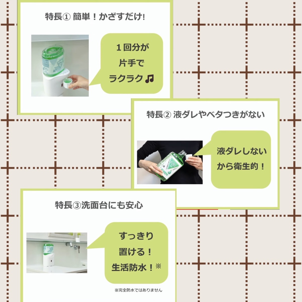 - 内容:自動ディスペンサー(器具本体)、専用キャップ、単3アルカリ電池4本、使用説明書、ステッカー