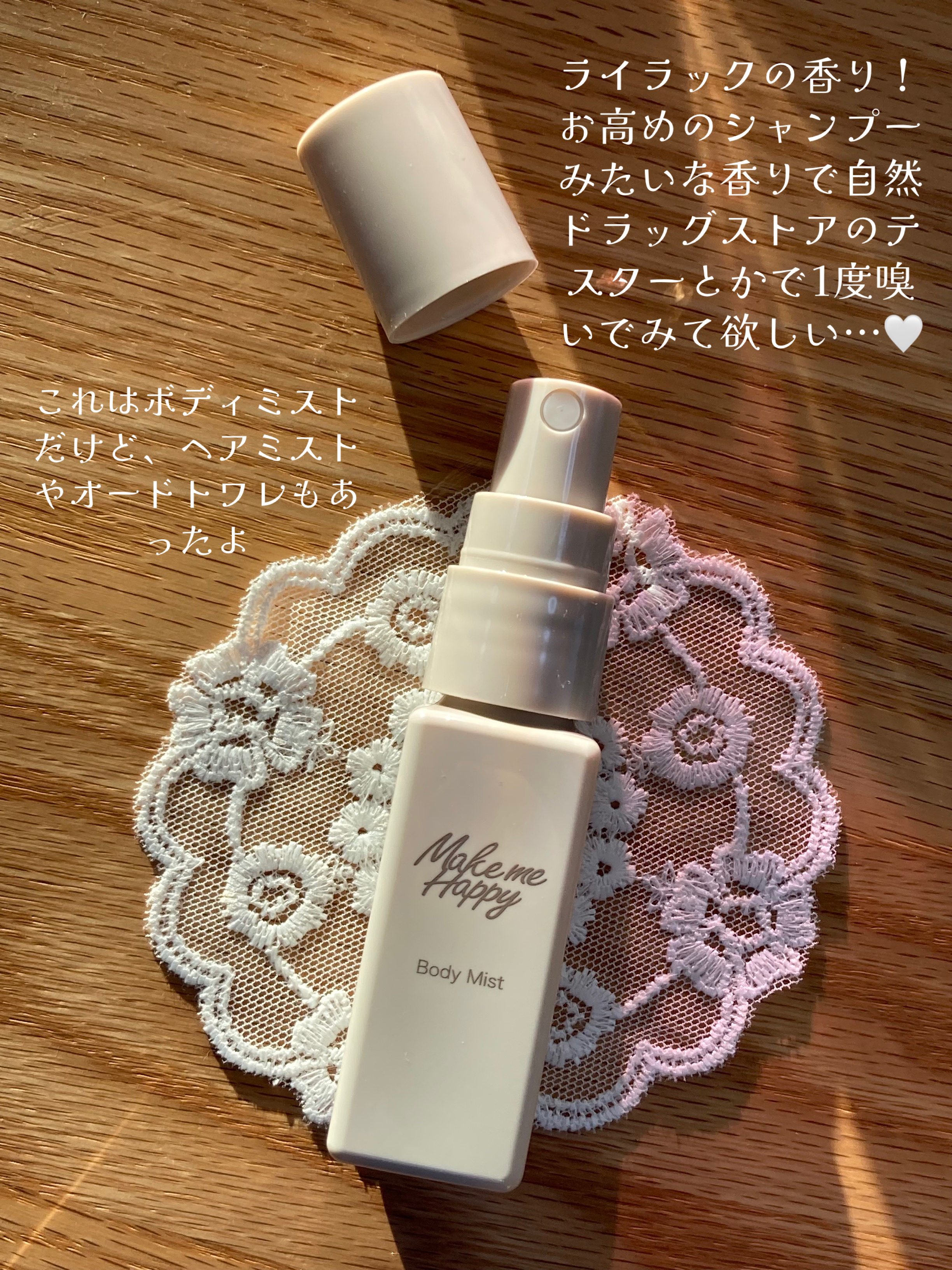 - ふんわり香るボディミスト 香水よりも手軽にお使いいただける、スプレータイプのミストです。 ポーチにも入れやすく持ち運びに便利なサイズなので、いつでも香りをお楽しみいただけます。 LILAC ほんのり甘い可憐なフローラルの香り グレープフルーツ、レモン、ロータス/ライラック、ピオニー、オスマンサス/シダーウッド、アンバー、ムスク