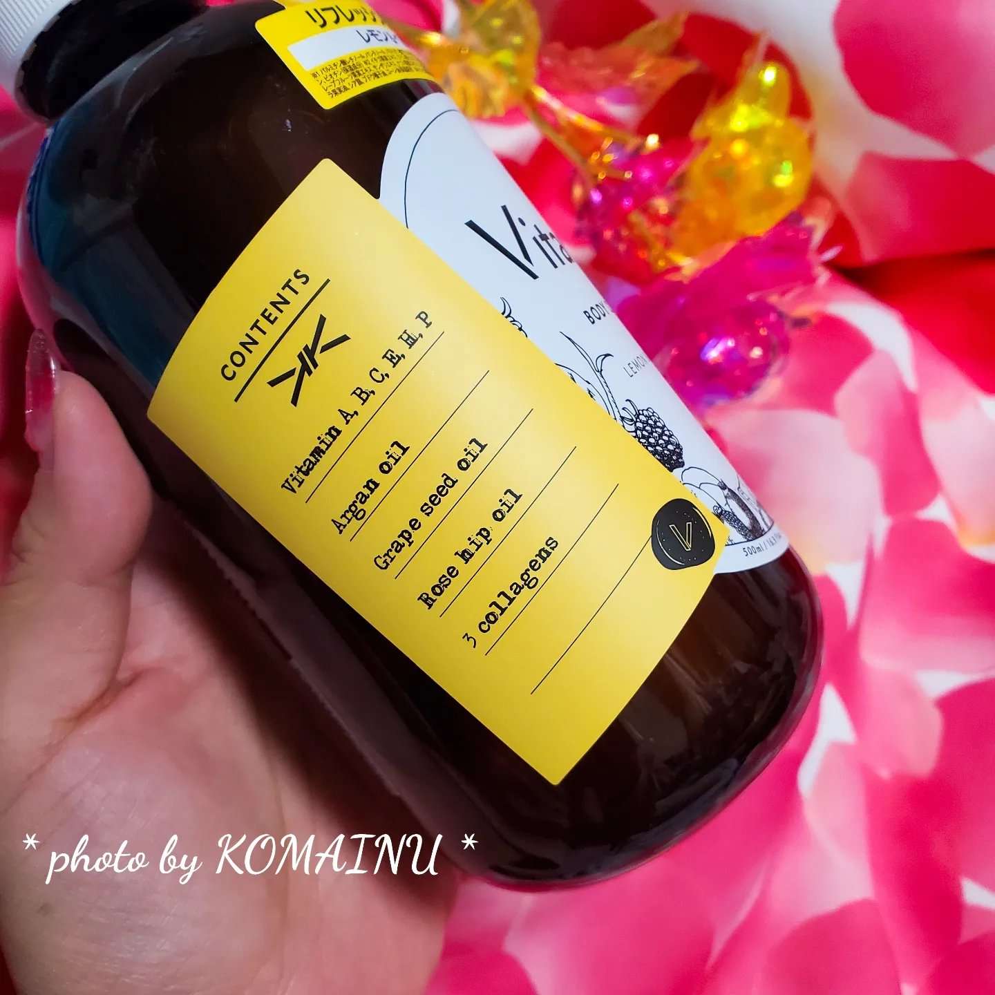 - 水、ラウリン酸、ミリスチン酸、水酸化K、ラウリルベタイン、グリセリン、コカミドDEA、香料、ラウラミドDEA、BG、グルコシルヘスペリジン、アセチルヒアルロン酸Na、PCA-Na、シロキクラゲ多糖体、パルミチン酸アスコルビルリン酸3Na、リンゴ果実培養細胞エキス、アルギニン、イチゴ果実エキス、アスパラギン酸、PCA、チャ乾留液、チョウジエキス、ライム果汁、チャ葉エキス、ビワ葉エキス、オレンジ果汁、グリシン、アラニン、アセロラ果実エキス、クダモノトケイソウ果実エキス、ヒアルロン酸Na、レモン果汁、ウコン根茎エキス、セリン、バリン、キイチゴエキス、イソロイシン、トレオニン、プロリン、グレープフルーツ果実エキス、サンザシエキス、ナツメ果実エキス、リンゴ果実エキス、サクシノイルアテロコラーゲン、ヒスチジン、フェニルアラニン、ブドウ果実細胞エキス、ユズ果実エキス、オリゴペプチド-20、イソマルト、加水分解ヒアルロン酸、加水分解コラーゲン、水溶性コラーゲン、パンテノール、ビオチン、アボカド油、アルガニアスピノサ核油、カニナバラ果実油、シア脂、ブドウ種子油、パルミチン酸レチノール、セラミドNP、ステアリン酸、ラウリン酸BG、乳酸Na、アルガニアスピノサカルス培養エキス、ヒドロキシプロピルメチルセルロース、キサンタンガム、ココイルグリシンNa、ポリソルベート20、レシチン、エタノール、コーン油、クエン酸、テトラヘキシルデカン酸アスコルビル、トコフェロール、安息香酸Na