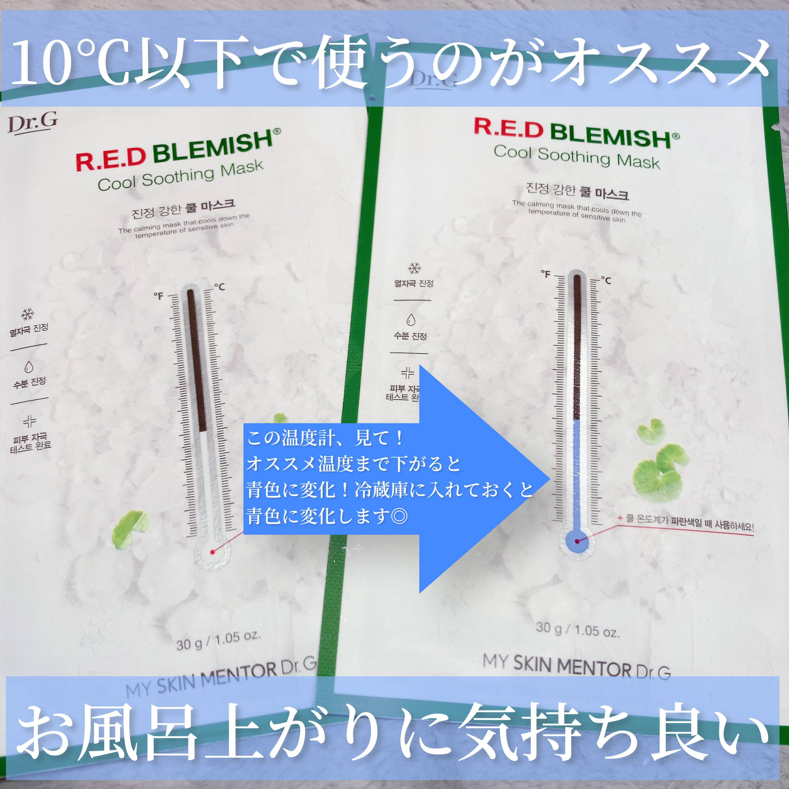 *Dr.Gレッドブレミッシュクールスージングマスク10枚入り*ご縁があり、Dr.Gさまより商品提供をいただきました❤︎肌の温度を6℃下げてくれるというクールマスク🩵5種類のシカ成分*1と5種類のヒアルロン酸*2を配合していて、クールに水...