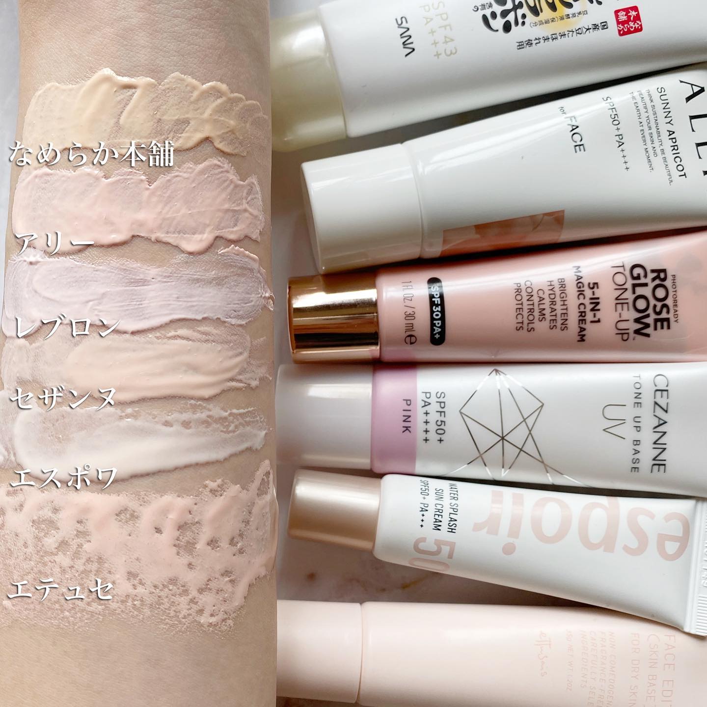 なめらか本舗 レチノール入りの色付き乳液 伸びが良くて軽い✨ スキンケアの最後にこれだけで UVカットと色補正が👍 アリー 焼けたくなかったらこれ👍 ファンデーションと合わせると 色んなファンデで試したけど 後半毛穴おちしやすくて🧐 単品で使ってコンシーラーパウダー仕上げ が1番綺麗に感じた。 エスポア ツヤ好きのプチプラ下地ならこれと思う みずみずしくて軽いつけ心地✨ 香りはフローラルぽいです🌷