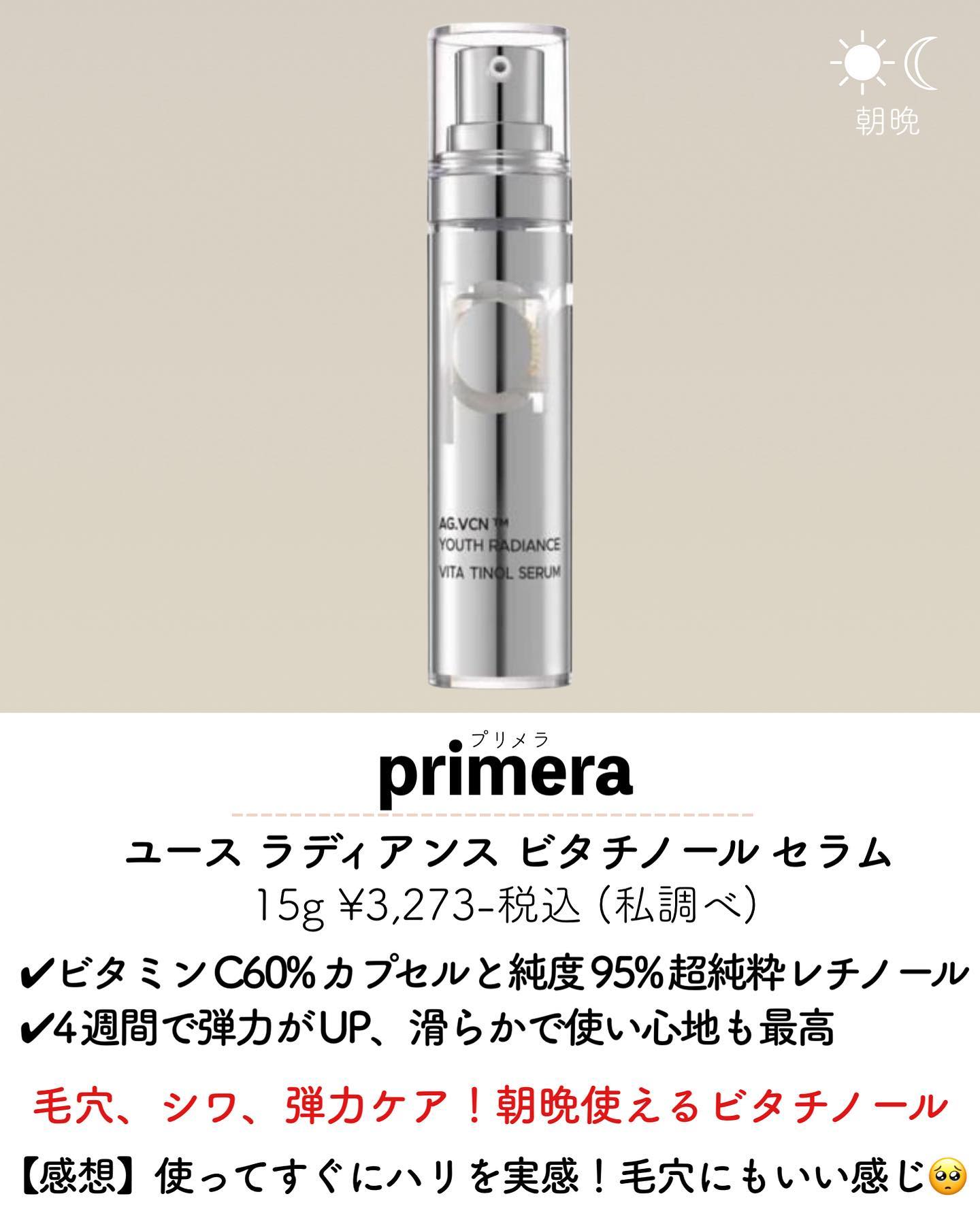 最近話題の「ビタチノール」って知ってる?韓国スキンケアブランド primera(プリメラ) の「ユース ラディアンス ビタチノールセラム」を試してみました! この美容液、レチノール(ビタミンA)+ビタミンC+ナイアシンアミド のトリプルケアで、肌のキメを整えてくれる優れもの。 使い始めてすぐに感じたのは、なめらかでふっくらした肌。夜に塗ると、翌朝の肌がつるんとして化粧ノリもUP✨