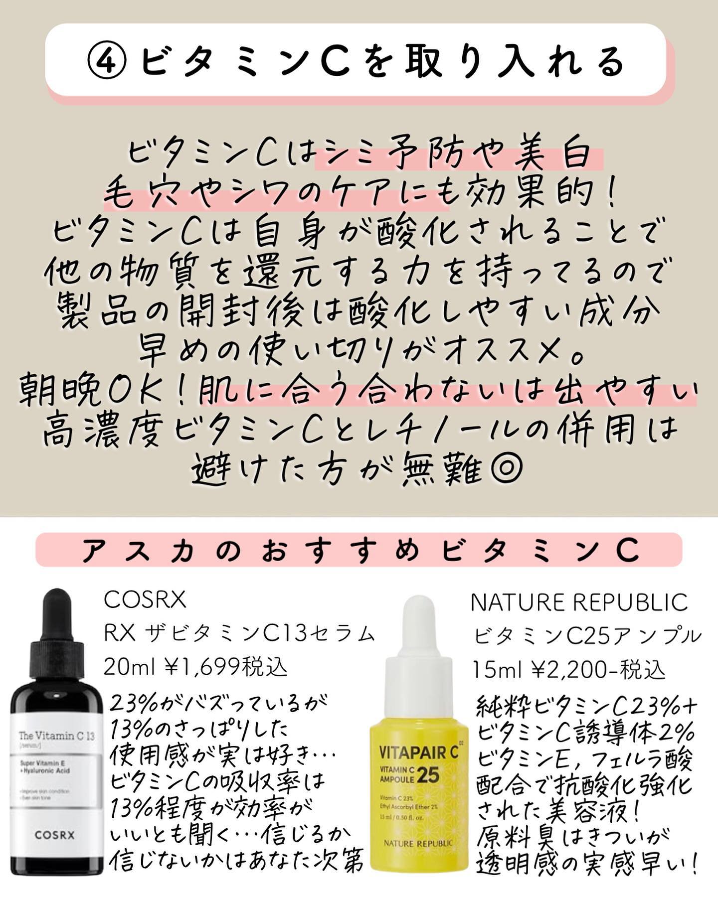 ビタミンCとレチノール…併用したい… 結論、併用で一番オススメなのは 化粧水をビタミンCにする。 ビタミンCとレチノールを併用 しなくてはならないわけではないので。