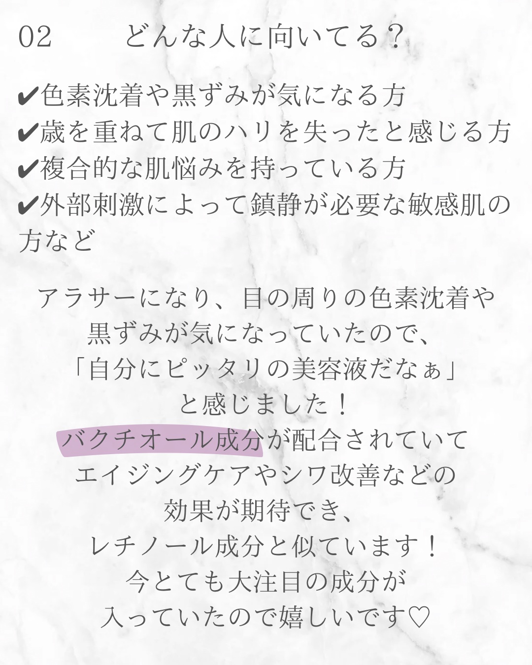 - <30ml> 精製水、トリ(カプリル/カプリン酸)グリセリル、BG、ナイアシンアミド、メチルトリメチコン、グリセリン、パンテノール、バクチオール、プロパンジオール、ラウリルグルコシド、ポリアクリレートクロスポリマー-6、ラウリン酸ポリグリセリル-10、アクリロイルジメチルタウリンNa)コポリマー、乳酸ミリスチル、カプリリルグリコール、セチルリン酸K、エチルヘキシルグリセリン、アデノシン、香料、1,2-ヘキサンジオール、イソステアリン酸ソルビタン、バクガエキス、トリペプチド-1銅、パルミトイルトリペプチド-1、シソ葉エキス、ユーカリ葉エキス、水添レシチン、グアイアズレンスルホン酸Na、アルギニン、サーファクチンNa、EDTA-2Na、ポリアクリロイルジメチルタウリンNa、フェルラ酸、グルタチオン、グリシン、セリン、アスパラギン酸、グルタミン酸、ロイシン、アラニン、リシン、プロリン、フェニルアラニン、トレオニン、バリン、イソロイシン、チロシン、ヒスチジン、メチオニン、システイン