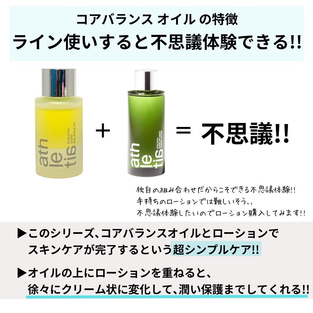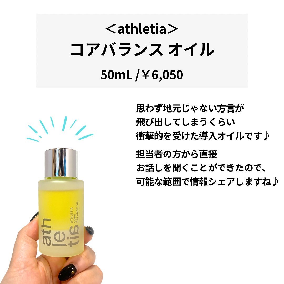 ◯athletiaコアバランスオイル導入美容液として。1回で3滴ほど。香りはあります!オーガニック系の柑橘のようなグリーンのような私はこの香りに癒されて深呼吸してます♡沖縄の夏にオイルって相性悪そうと思ってました⚡️けど会社で1日中エアコンが...