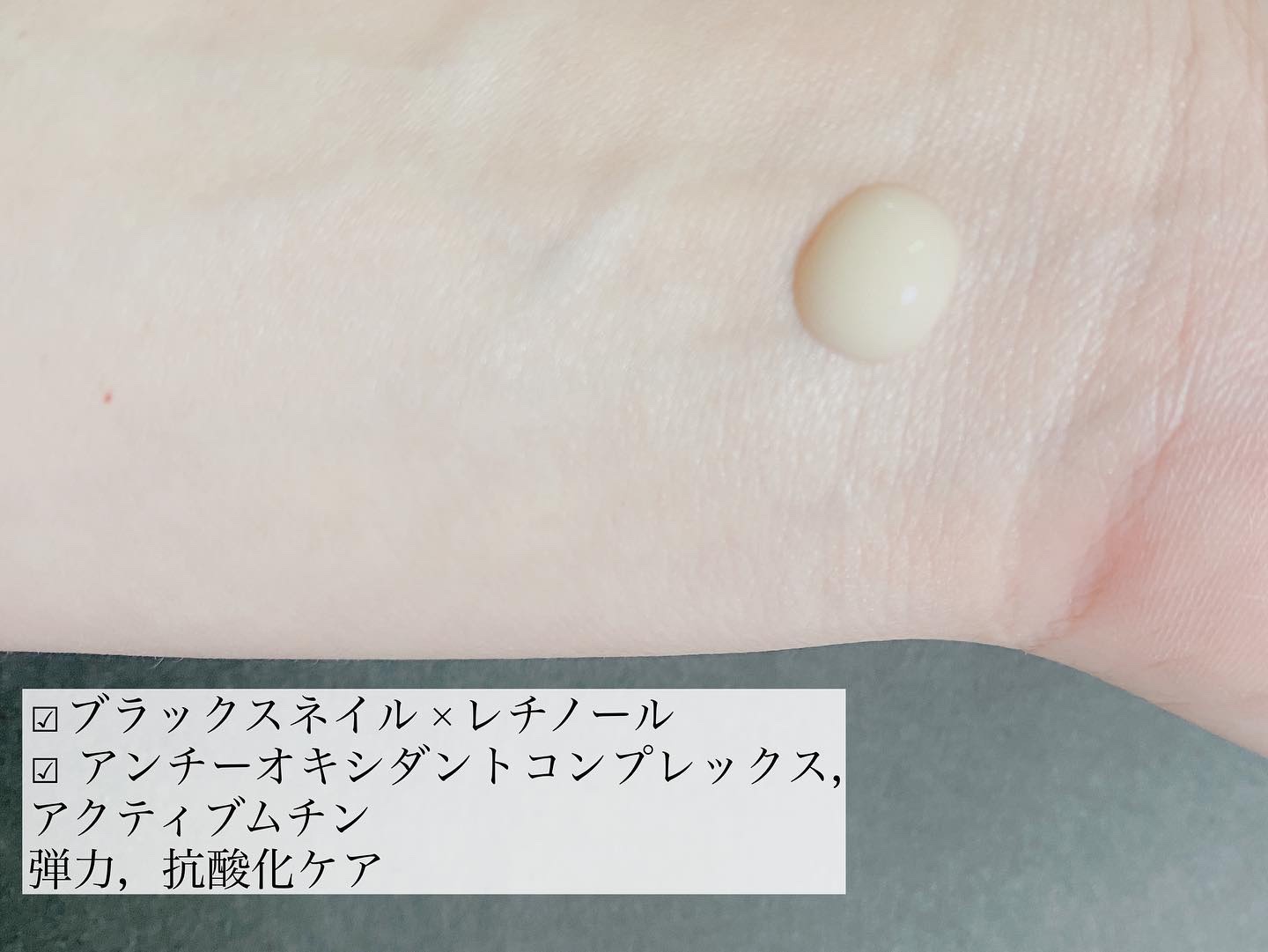 低刺激のレチノールで敏感肌の方も比較的使いやすそう👏🏻 しっかりめテクスチャーの美容液でクリーム色です💛 こっくりしたテクスチャーのクリーム🤍 スルスルと肌には伸ばしやすいです♡ 夜たっぷりと塗っておくと朝起きた時の肌がもっちりしっとり💓 アンチエイジングにピッタリな感じがします🫶🏻