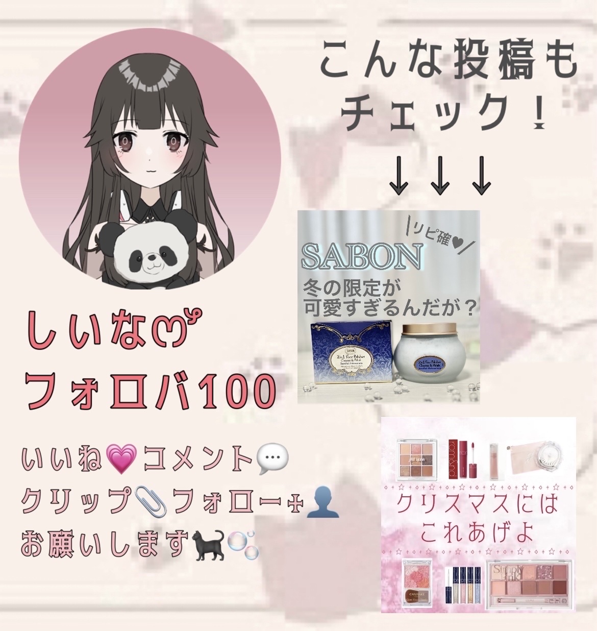 クリスマスなので女の子が大好きなキラキラした可愛いパケのアイテムを選んでいます! 自分のご褒美用にもおすすめです♡ 【〜1000円】 ・CANMAKE グロウフルールチークス ・無印良品 リップエッセンス 【〜2000円】 ・rom&nd リキッドグリッターシャドウ ・rom&nd ゼロベルベットティント ・Jill leen シャイニングミニアイシャドウパレット 【〜3000円】 ・JILL STUART コンパクトミラー 【〜5000円】 ・CLIO プロアイパレット ・SABON フェイスポリッシャー